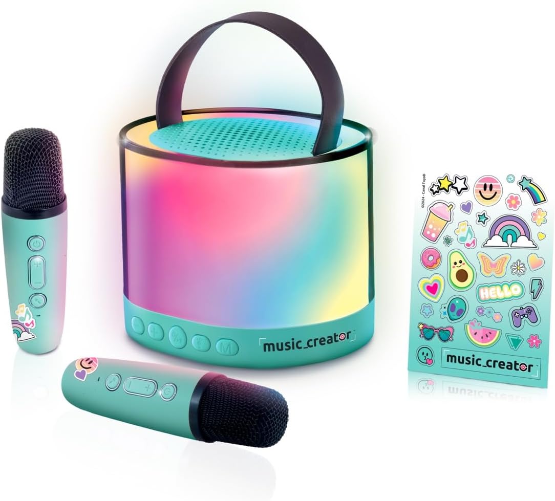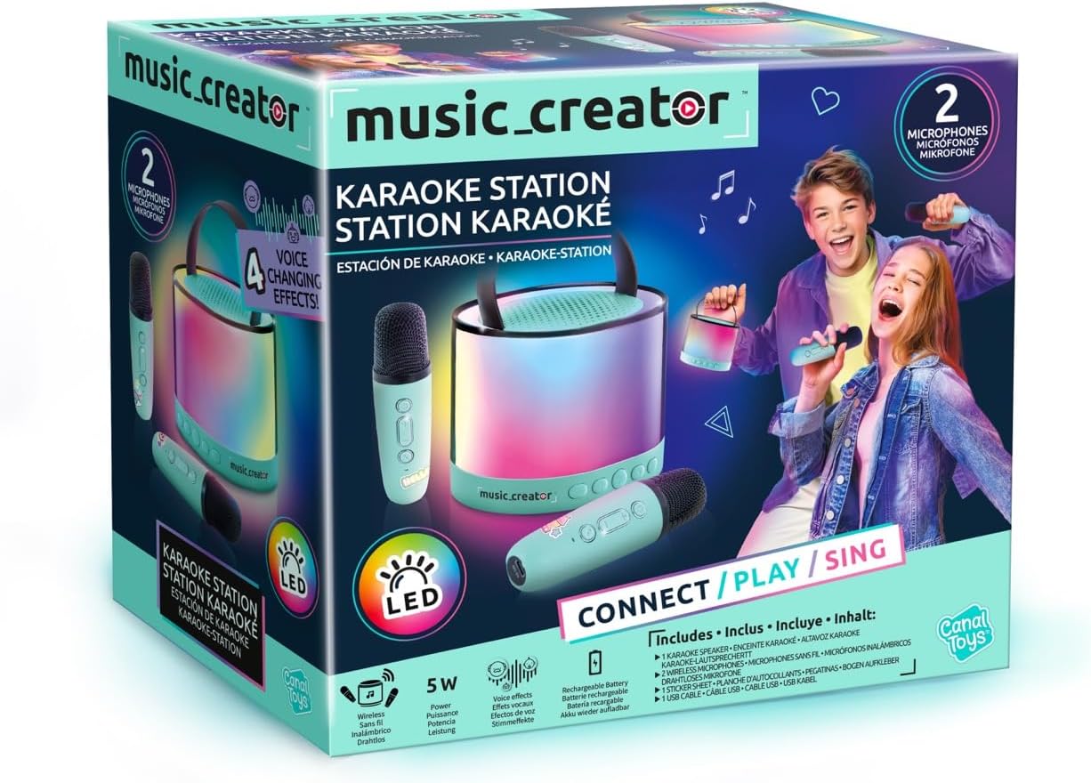 Hours of fun and creativity with this wireless mini karaoke station! Perfect for playing music and singing solo or duet with the 2 wireless microphones included. Very easy to use, just connect it to a music source (Bluetooth, SD card...) to play the songs and sing! This karaoke station can be taken anywhere for impromptu song moments with family or friends. The built-in voice effects and LED lights make it easy to create a festive atmosphere. The rechargeable battery of the speaker and microphones ensures hours of undisturbed vocals, so the entertainment never stops. The perfect gift for young and old who love music and song! Includes 1 wireless speaker, 2 wireless microphones, 1 USB-C cable and 1 x user manual. This product has been developed in France. Box size: W20 x D12 x H18 cm Light speaker size: W11 x D9.2 x H8.6 cm. Microphone Size: D3.7 x H 13.5 cm.