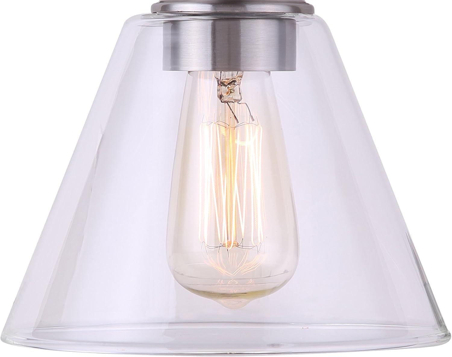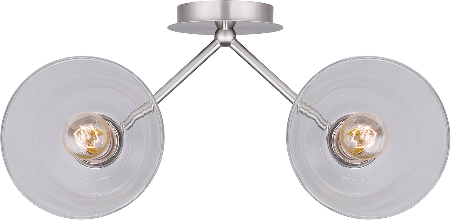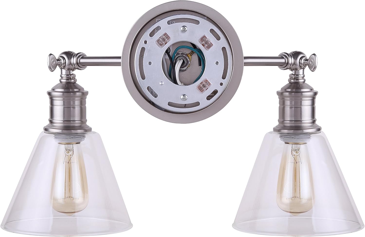 Canarm LTD Style Larken 2 Light Vanity Light, Brushed Nickel with Clear Glass - The Larken vanity collection in a brushed nickel finish features clean, simple lines paired with clear, cone-shaped shades that showcase vintage style bulbs. Provides plenty of bright light and is ideal for bathrooms, powder rooms and dressing rooms. Features the Easy Connect push-in connection system for easier, faster, safer installation. This 2 light vanity has adjustable heads that allow you to change the direction of light as needed. Uses 2 100W Type A bulbs (not included). Canarm has a long and successful history of supplying lighting and ceiling fans. They work diligently to create a comprehensive selection of styles and designs as well as maintaining high standards of product quality and value.