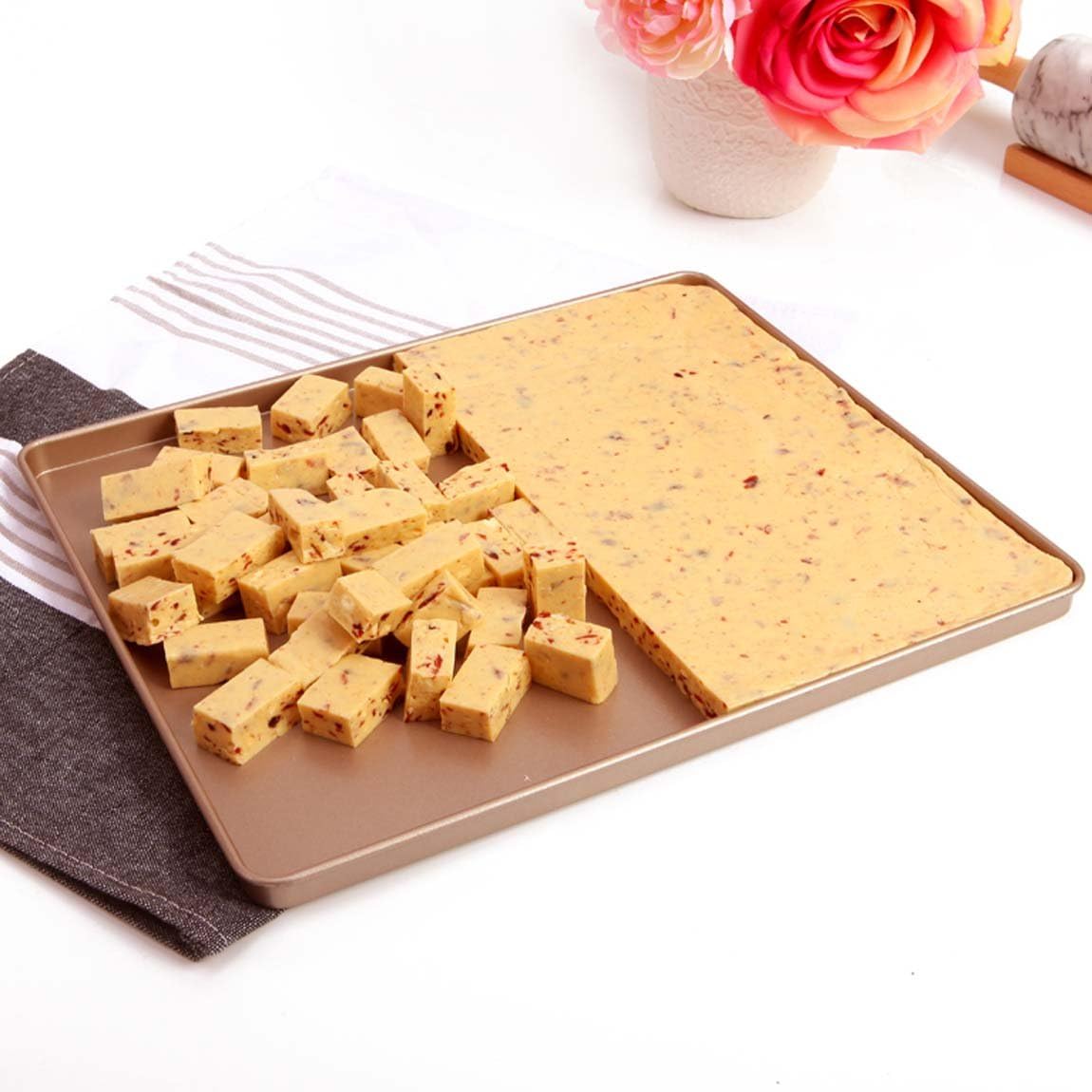 Product Description: Constructed of heavy-gauge steel that provides an even-heating performance, baking experts prefer for perfectly-browned baked goods. The non-stick coating makes food release and clean-up a breeze. Measure: 34.5x24.6x2.5 (13 inch) / 39.5x27x2.5cm (15 inch) Weight: 688g (13 inch) / 830g (15 inch)