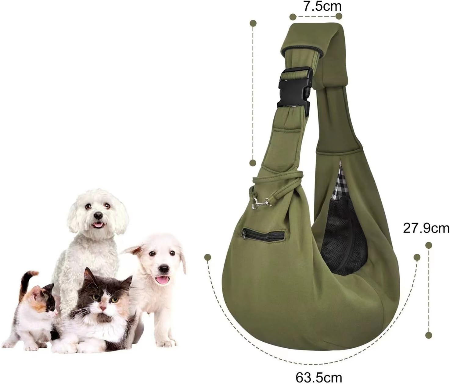 Take Your Furry Friend Anywhere with Comfort and Style!The Canvas Pet Sling Bag is the perfect solution for pet owners who love to bring their cats and dogs along on adventures. Made with high-quality, eco-friendly green canvas, this pet carrier is both durable and stylish. Its reversible design allows you to switch to a chic black-and-white checkered pattern for a fresh look.Designed with functionality in mind, the bag measures 25.2 inches long and 11 inches tall (64 cm x 28 cm), providing ample space for pets weighing up to 13 lbs (6 kg). The hard bottom panel ensures stability, so your pet feels secure while on the go. Additionally, the built-in safety strap prevents your furry companion from jumping out or falling during travel.Comfort is a priority! The adjustable shoulder strap features a thick, padded cushion to minimize strain, making it ideal for long walks or outdoor trips. Whether you’re heading to the park, running errands, or traveling, this sling bag is a must-have for pet lovers.Enjoy quality time with your pet wherever life takes you with this thoughtfully designed carrier!