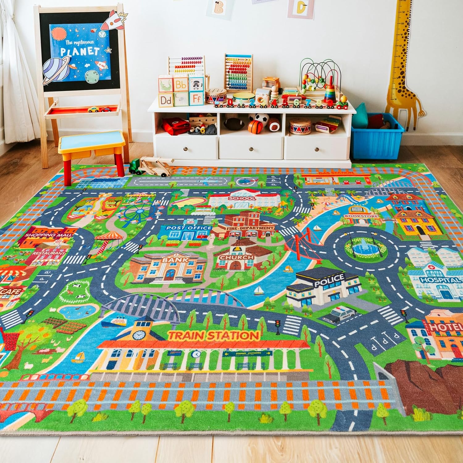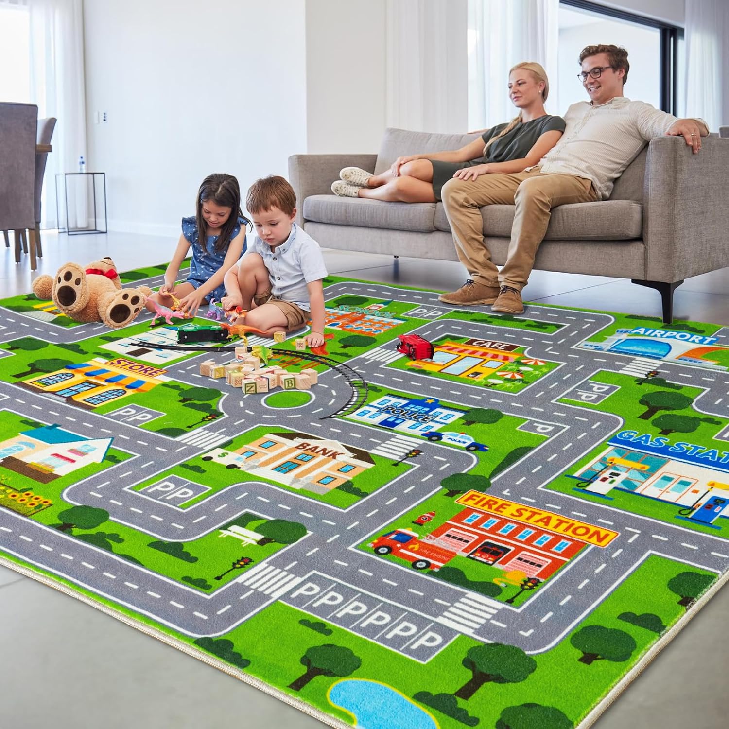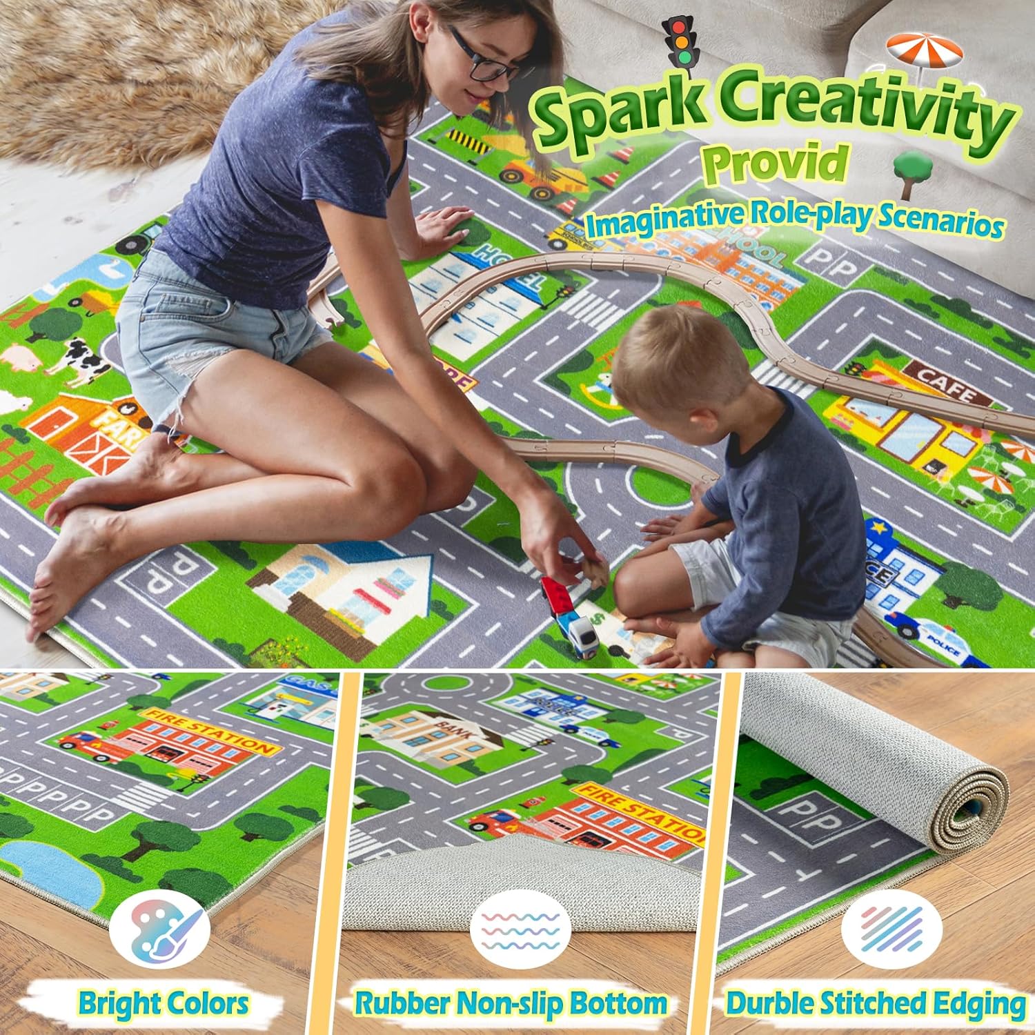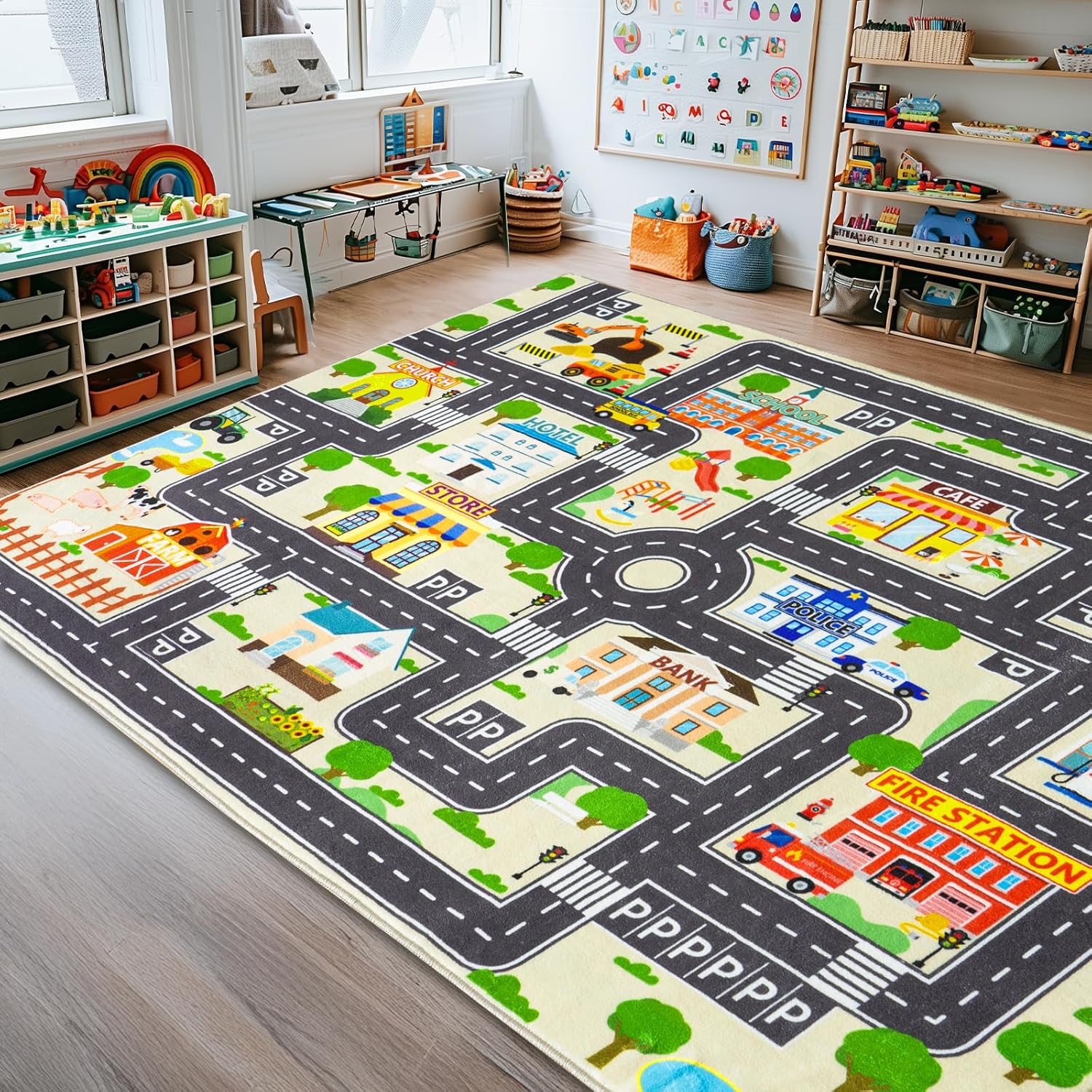 plumlik Car Rug Play Mat for Kids Toy Cars, City Road Traffic Playmat for Kid Bedroom, Non-slip Machine Washable Kids Rugs for Learn and Have Fun 4'x5'/ 48"x60", Green
