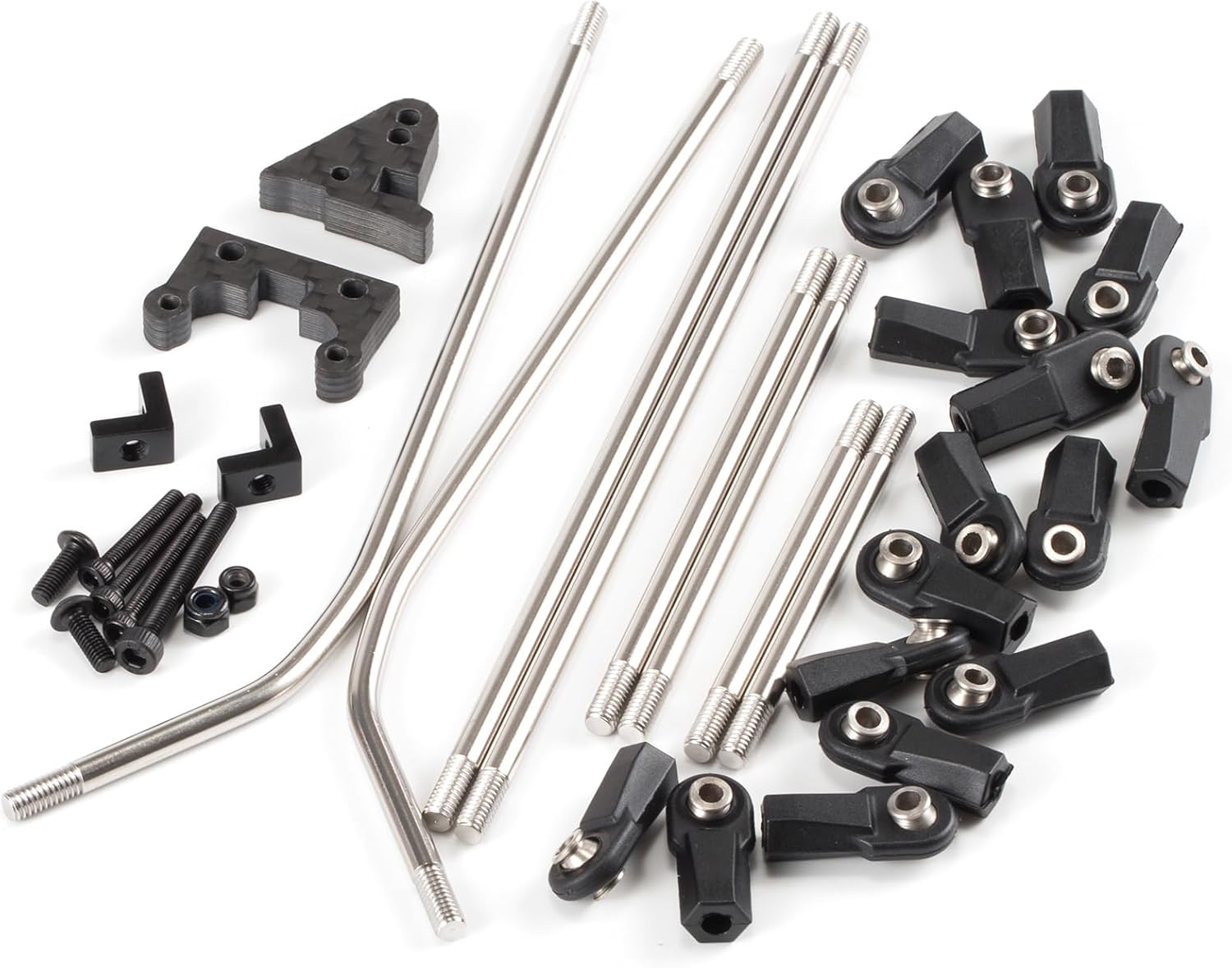 Note: This is a builders chassis and is not a direct bolt on for any base truck, so be prepared for problem solving as not every axle, motor, transmission that is available on the market can be accounted for all in one.Feature: Frame rails laser cut from 3mm carbon fiber. The higher belly allows for a lower stance for solid axled trucks for even better breakover. Skid hole pattern is for Axial 3 gear transmission or simular. Provided you with multiple front and rear shock mount positions for shock tunning and body mounting. Multiple front and rear mounting options for wheelbase tunning. Included carrier bearing is still fully adjustable left to right, adjustable pitch, and fwd and back via multiple mounting locations. The rear of the frame is slightly flat, for an easier cleaner look when running a truck bed.Chassis Kit Includes: x1 Carbon Rails (pair) x1 Delrin Skid Plate x1 Aluminum Carrier Bearing x1 3D Printed Rock Sliders (pair) x3 70mm Chassis Brace x1 Nylon Spacers Kit x1 Hardware KitNeeded to Complete:-SHOCKS 80mm-90MM respectively for travel needs. No more than 90mm recomended. Big bore shocks are a great comparable budget option as well.-TRANSMISSION compact required. EXO, Dlux Portal and others.-MOTOR smaller is better. Recomend small outrunner motor like 3BROS 3523.-3x DRIVESHAFTS recomend "cut to length" in front for thier reduced shaft size for clearance and strength. Larger(normal) diameter plastic shafts can be used in rear no issue to save weight and money.-ESC compact am32 of your choice recomended. DLUX, HOLMES HOBBIES, 3BROS, SEQURE etc.-AXLES, 20% or more total OD recomended. 30% is ideal.-SERVO.