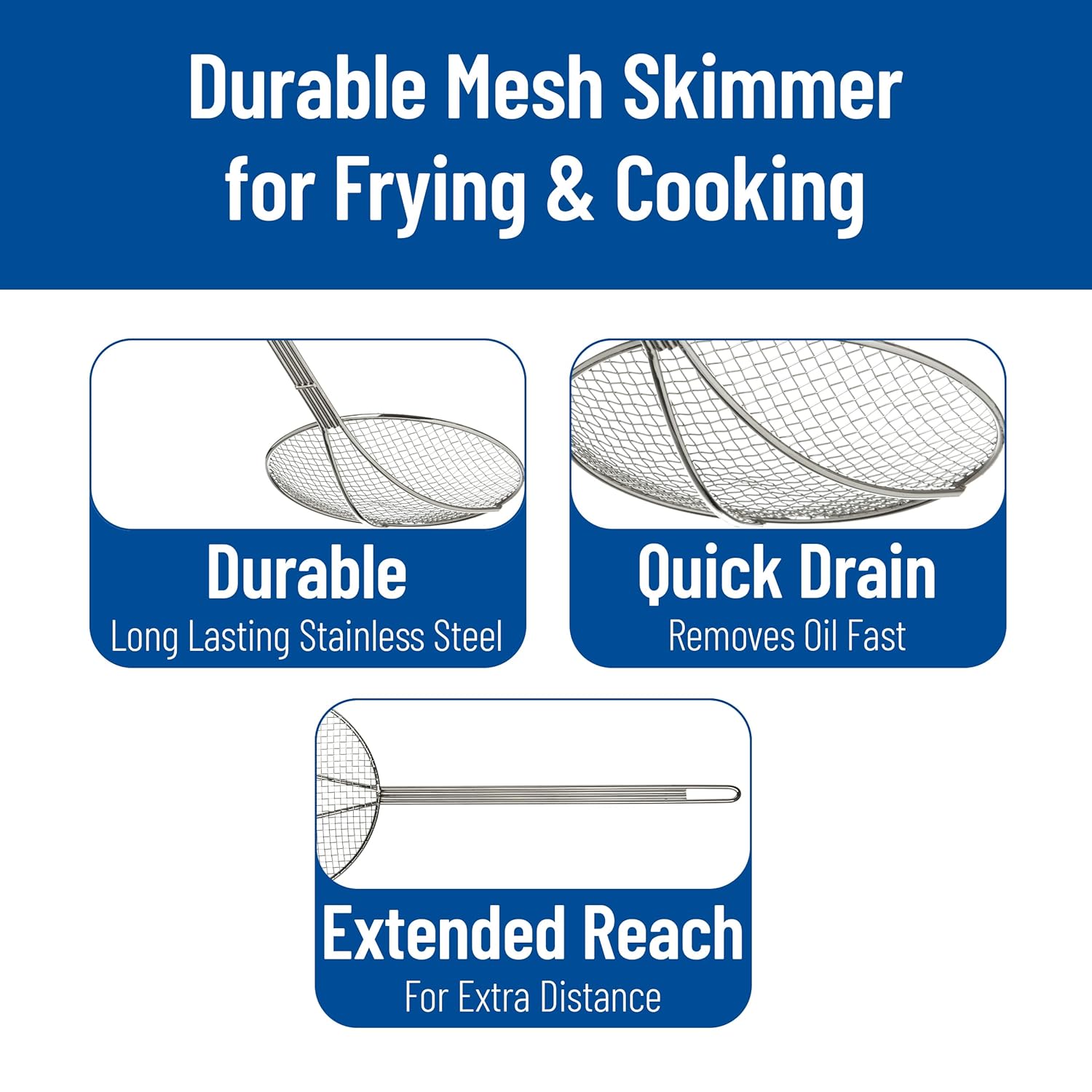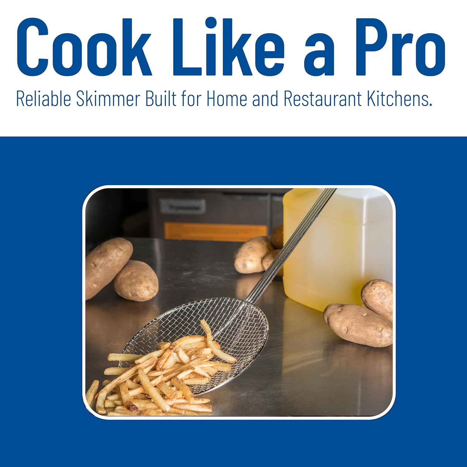 This Carlisle 601528 skimmer is 22" in length, with an 8" diameter wire mesh bowl, and is suitable for lifting foods from a deep fryer. It is made of nickel steel for strength and durability and is chrome-plated for resistance to corrosion. The handle has a hole at the end for hanging and draining. This skimmer is dishwasher-safe.Carlisle manufactures food service equipment and supplies and sanitary maintenance tools and supplies for commercial, industrial, and institutional facilities. The company, founded in 1954, is headquartered in Oklahoma City, OK.