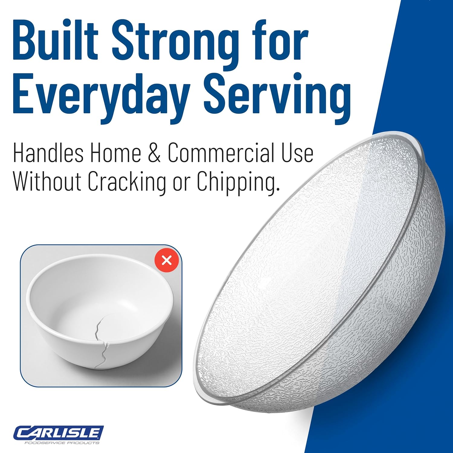 Carlisle polycarbonate round pebbled salad bowl. Pebbled exterior resists scratches. Smooth interior is unaffected by salad oils, food acids, or dressings. Durable polycarbonate material. NSF listed, dishwasher safe. NSF listed as N7212PC. Measures 12.81-inches diameter by 3-3/4-inches height. Made in the USA.