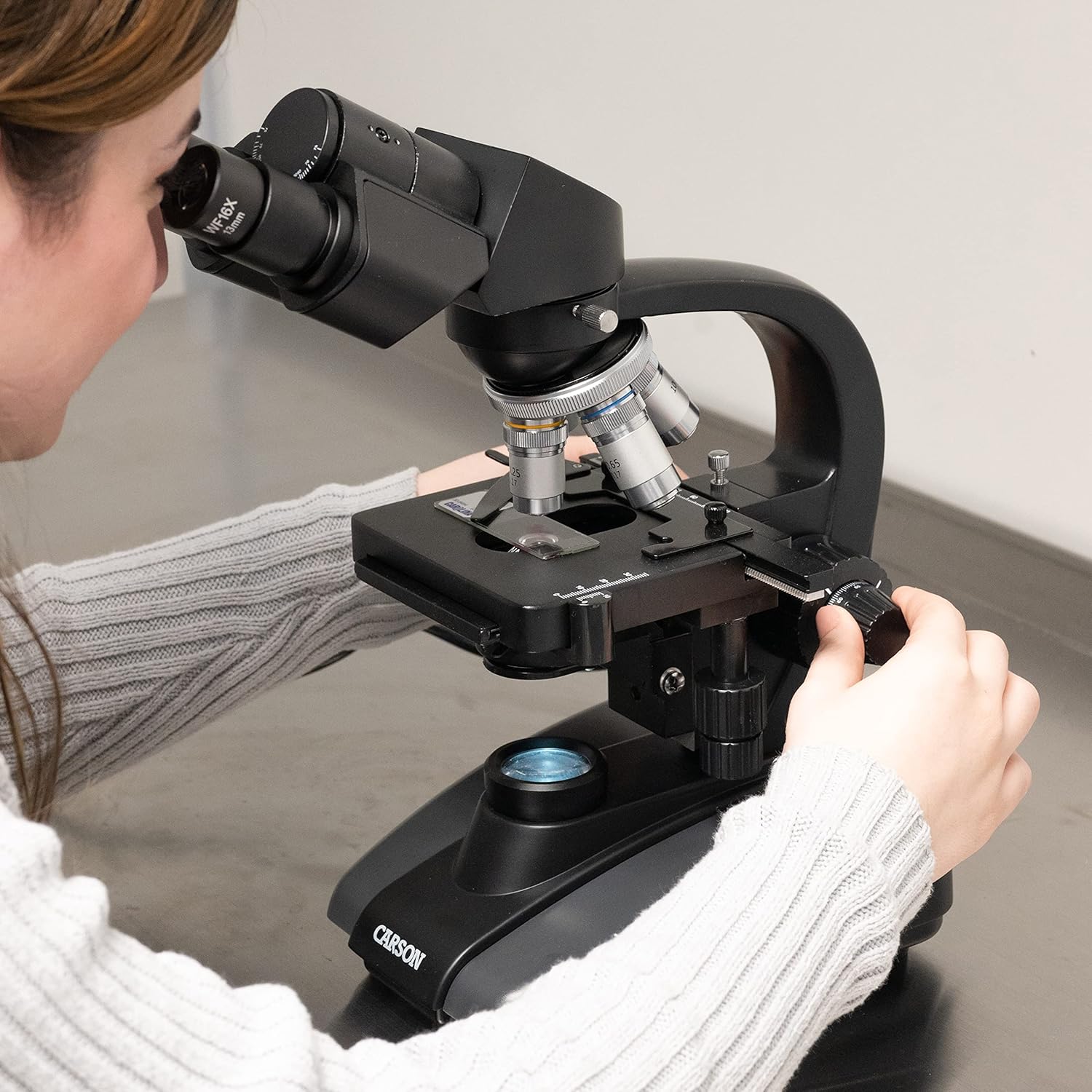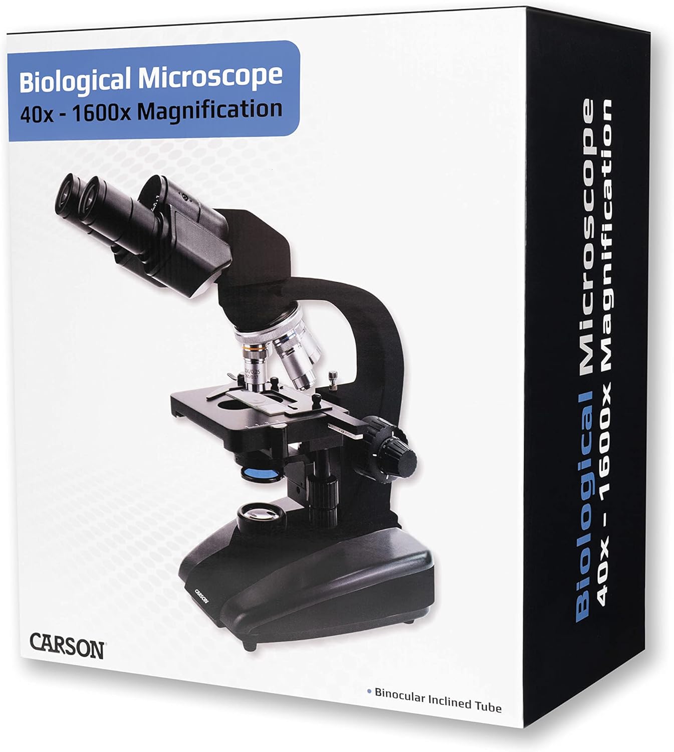 Introducing Carson’s Compound Microscope, the perfect tool for professional science and research! This state-of-the-art microscope is designed to deliver superior performance and precision, allowing you to view images with crystal-clear clarity and brightness. The Double Layer Mechanical Stage ensures stable and precise specimen positioning, while the Coaxial Focuser with Course and Fine Adjustment offers effortless focusing control. The Abbe NA 1.25 Condenser with Iris Diaphragm and built in LED lighting deliver bright and clear images, even in low light conditions, while the Rotatable Binocular Head provides greater flexibility and ease of use. With a wide range of high performance features and two sets of eyepieces (WF10x, WF16x) for a 40x-1600x magnification range, this Carson Biological Microscope sets a new standard for high-performance science tools.The Abbe NA 1.25 Condenser with Iris Diaphragm is an exceptional feature that provides optimal illumination, ensuring that every observation is crystal clear and easy to see. The Abbe NA 1.25 condenser is designed to collect light from the built in LED light source and concentrate it onto the specimen. This allows the user to easily adjust the light intensity, which can result in better contrast and clarity of the specimen. The Iris Diaphragm is also beneficial, as it provides the user with more control over the amount of light that is allowed to pass through the condenser. The user can adjust the diaphragm to allow more or less light to pass through, resulting in better image quality. Additionally, the Abbe NA 1.25 condenser helps to reduce chromatic aberration, which is a type of optical distortion caused by different colors of light being focused at different distances.Equipped with a Double Layer Mechanical Stage, the microscope allows for smooth and precise movement of specimens, making it ideal for professionals who demand nothing but the best. The Coaxial Focuser with Course and Fine Adjustment ensures that users can achieve the perfect focus for their specimens with ease. And with two sets of eyepieces, you can easily switch between magnifications, allowing you to observe specimens in greater detail and adjust the microscope to your exact requirements, resulting in superior performance and precision.Optimized for performance and accurate image quality, this Compound Microscope features all glass optics and a 32mm blue filter to help reduce glare, enhance contrast, and provide precise observations. Whether examining biological specimens or investigating the structure of materials, this microscope delivers unmatched image quality and clarity.This microscope is designed to meet the high-performance demands of professional scientists, while also being accessible to students and enthusiasts alike. With its exceptional performance, precision, and versatility, the Carson Compound Microscope is the perfect choice for anyone looking for professional-grade quality and performance.
