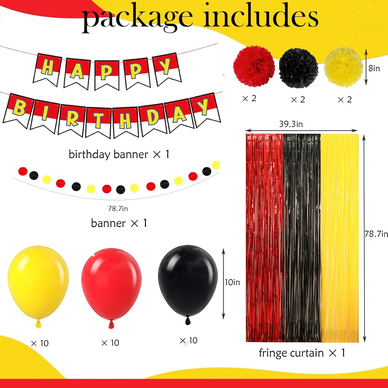 Do you Want to decorate your party in a simple way? Do you Want to make the table look more thematic? Than please choose us! Our birthday party supplies include most of the party decorations you want, saving you the time to hunt around for accessories.Package includes:1 x Happy Birthday Banner30 x Latex Balloons1 x foil fringes curtain6 x tissue paper pom poms1x circle dot hanging garland*Notes:1. Please allow a little error on the size due to manual measurement.2. The color might exist slightly difference due to different displays and light.3. If you have any questions with product, please feel free to contact us!
