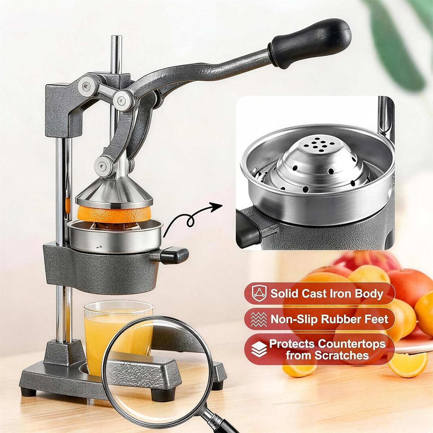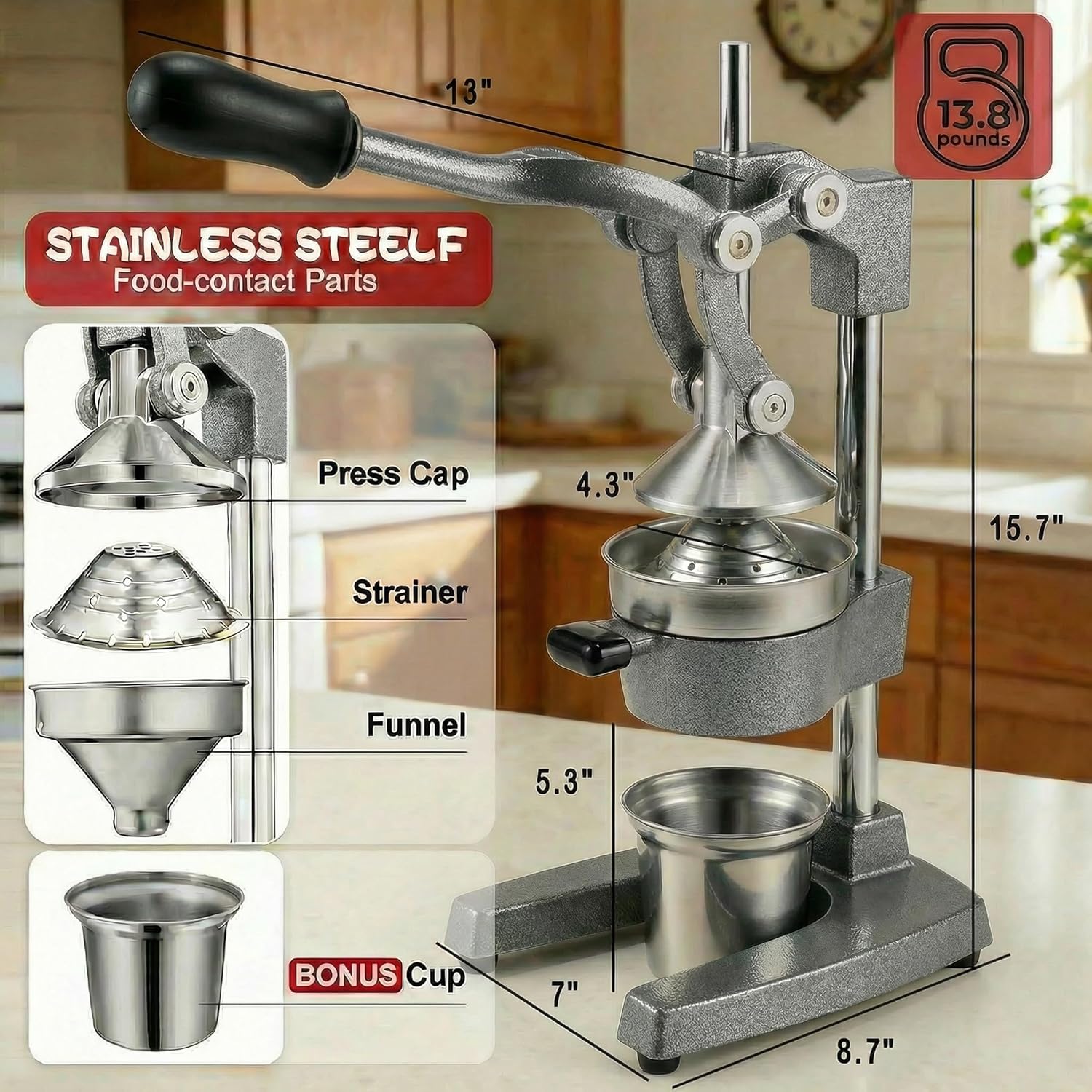 | Included Components | 304 Stainless Steel Juice Cup, Juicer Press Body, Removable 304 Stainless Steel Strainer |