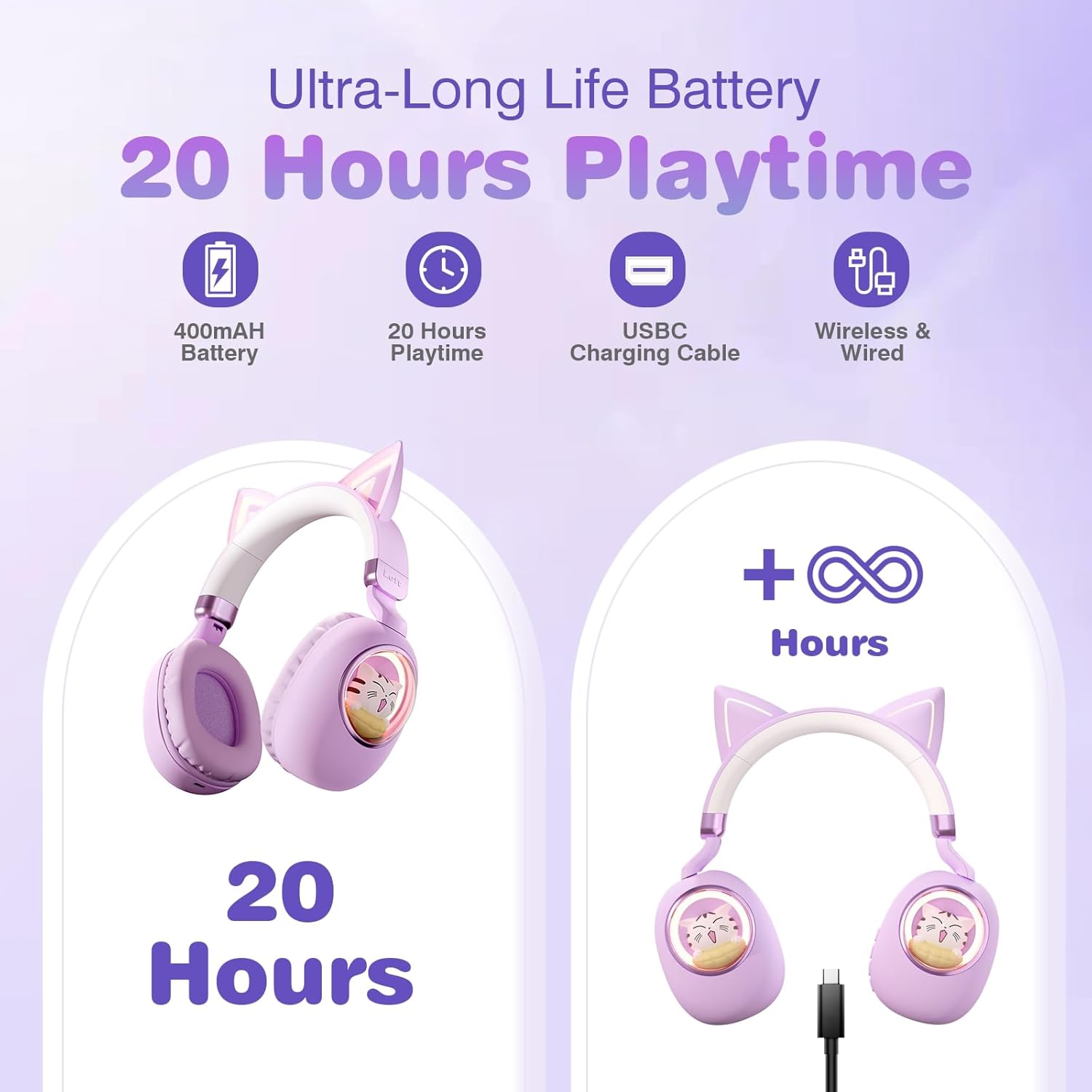 Why choose Xmenha kids headphones?Xmenha kids headphones are made for accompanying kids to grow up, it is a good partner that meets kids' diversified needs. Whatever wear to study, play, immerse and enjoy music, the kids headphones are a tool to help kids improve attention, stimulate practical ability, cultivate music appreciation, improve language skills, enhance imagination, and so on. With regards to parents. the kids Bluetooth headphones are wonderful gifts for kids exceeding 3 years old, no matter for Xmas, Thanksgiving,New Year, Back to School, and so on.Specification:Bluetooth version: 5.3Headphone battery capacity: 400mAhTransmission distance: about 15mPlaying time: about 20 hours (Lights on),about 8 hours (Lights off)Charging time: 2.5 hourCharging port: USB-CSupport system: all devices and mobile phones that support BluetoothNotes:1. Please read the instruction manual carefully before use.2. If you receive a defective product or have any questions during use, please feel free to contact us.Packing list:Kids Cat Ear Headphones Wireless *1USB C cable *13.5mm audio cable*1User Manual *1Exquisite box *7