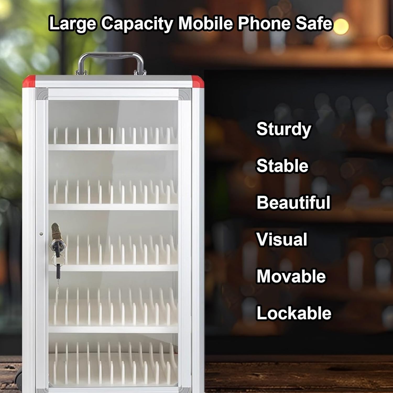 This mobile phone storage cabinet is designed with 60 slots, each featuring a handwritten label, making it easy to track and identify phone ownership, thus preventing mix-ups. The pull ring handle is ergonomically designed for smooth and effortless opening and closing. The cabinet's rounded corners enhance durability and pressure resistance, providing added protection against accidental bumps and collisions. Ideal for various environments such as schools, conference offices, factories, restaurants, laboratories, fitness clubs, and military settings. Specifications: Material: Aluminum alloy + Acrylic + PVC Shape: Rectangular Lock type: Key lock (2 keys included) Installation type: Freestanding or wall-mounted Number of slots: 60 Product size: 56x27x20 cm / 22x10.6x7.8 inches Slot size: 17.6x1.4 cm / 7x0.5 inches Package includes: 1 Mobile phone storage cabinet 4 Universal wheels 2 Keys Mounting screws