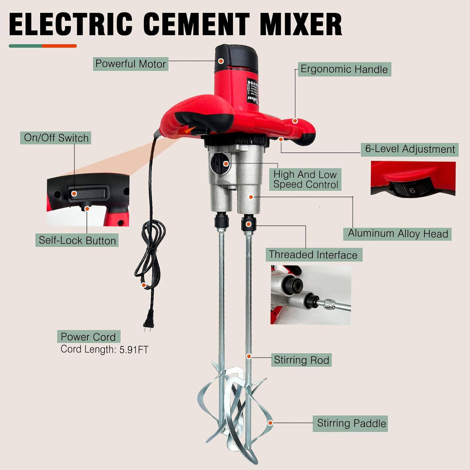 • 【Six-Speed Adjustment, Efficient Mixing】 This cement mixer offers six adjustable speeds ranging from 350 to 930 rpm, equipped with spiral blades and a self-locking switch, ensuring rapid and even mixing. It is suitable for a wide range of materials, including paint, cement, feed, mud, ink, slurry, gypsum, and cement-based adhesives.