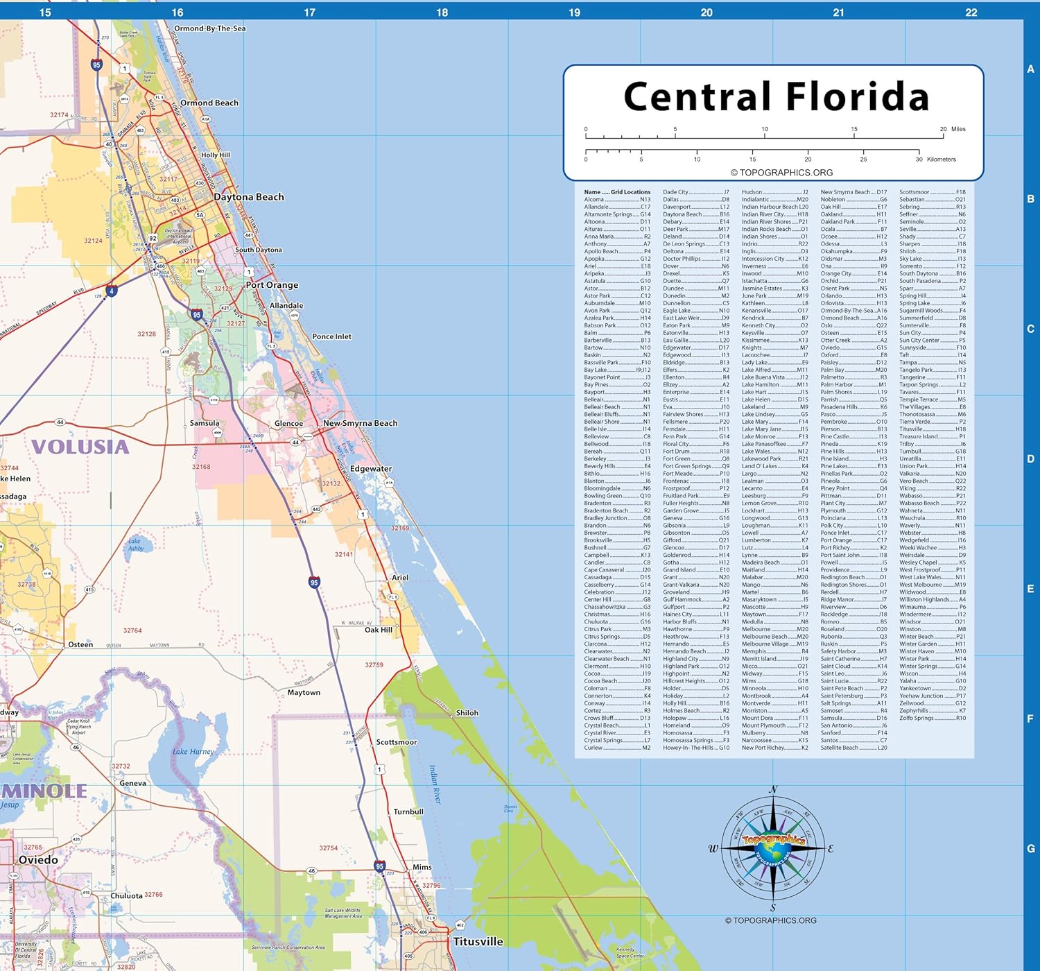 Our Central Florida laminated wall map shows counties, towns, cities, major roads and highways, ZIP codes, and major points of interest. Counties included are: Pinellas, Hillsborough, Polk, Osceola, Indian River, Orange, Seminole, Lake, Volusia, Sumter, Citrus, Hernando, Pasco, and parts of surrounding counties. Major cities included are: Orlando, Tampa, St. Petersburg, Clearwater, Brandon, Palm Bay, Spring Hill, Lakeland, Deltona, Largo, Clearwater Beach, Melbourne, Riverview, Daytona Beach, Pine Hills, Kissimmee, Palm Harbor, Ocala, Port Orange, Sanford, Poinciana, The Villages, and Bradenton, among many others. An index of community names is included. The laminated map is rolled and shipped in a tube. Read more