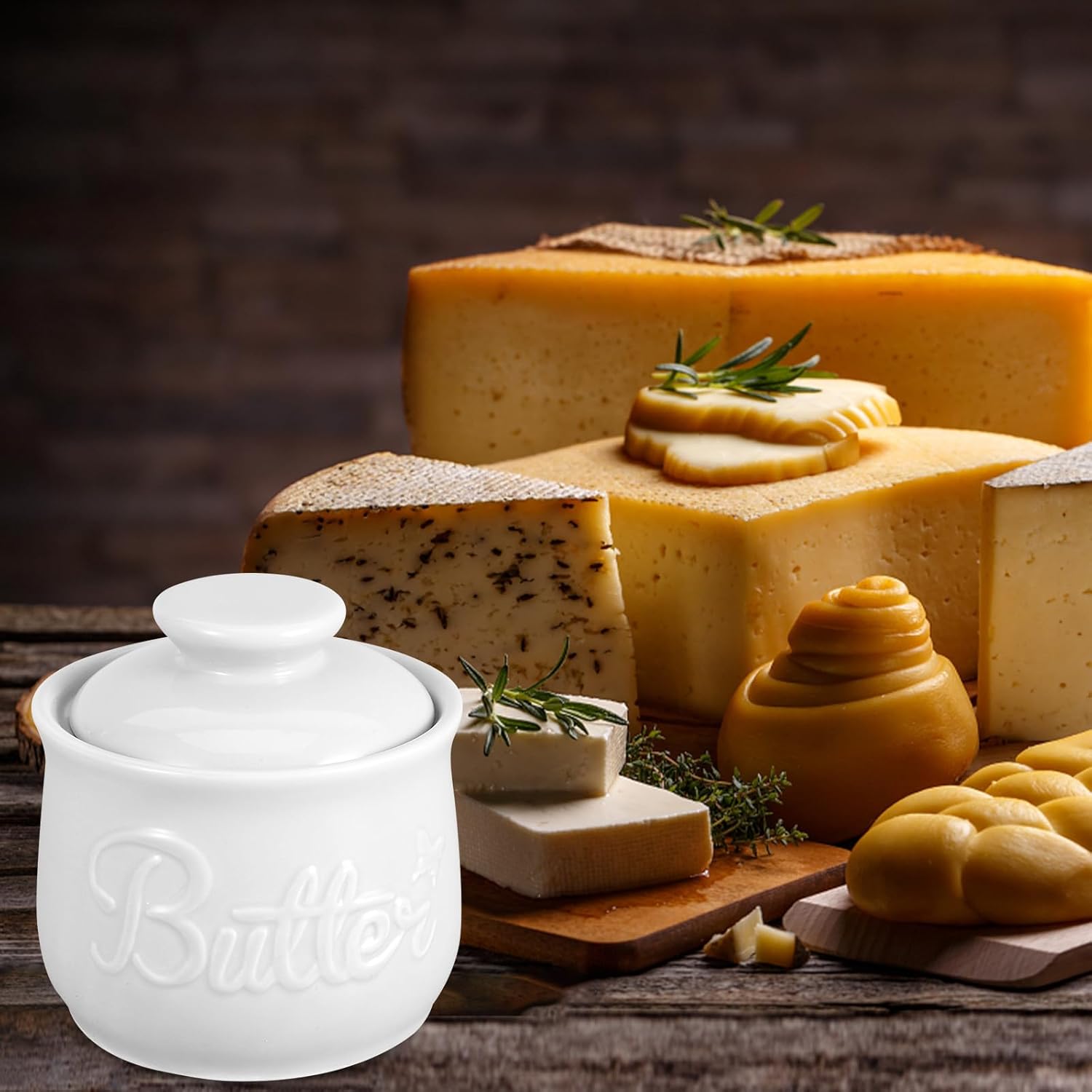 Package List 1 x butter jar Features -Material: made from hardwearing ceramic, this butter out air and light, ensuring your butter stays fresh and flavorful for longer periods. -Design: featuring an elegant ceramic design, this butter dish adds a touch of sophistication to your kitchen decor, making it both a functional and decorative piece butter preservation crock. -Color:White -Product Info:Butter can -Capacity: designed with a large capacity, this butter dish can store multiple sticks of butter, making it great for family use and reducing the need for frequent purchases french butter crock. -Seal: equipped with a tightsealing lid, this butter dish prevents spoilage, extending the shelf life of your butter and keeping it in optimal condition butter storage crock. -Versatility: this multifunctional dish is not only ideal for storing butter but also suitable for cheese, margarine, and other spreads, offering convenience and practicality stylish french butter keeper. -Material:Ceramics -Size:10.50X10.50X9.00cm/4.13X4.13X3.54inGoods Descriptionbutter crock with cover The vintage butter dish with lid is a beautiful and practical solution for storing your butter.butter keeper with lid This butter holder is great for adding a touch of nostalgia to your kitchen, making it both a functional and decorative piece.counter butter dish Its ceramic construction durability, while the lid keeps the butter protected
