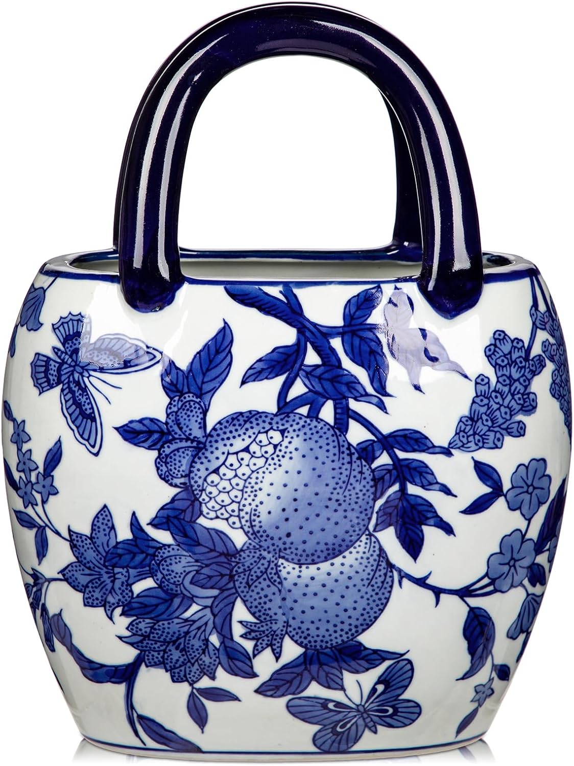 Bring Timeless Elegance to Every SpaceDiscover the perfect fusion of art and function with our ceramic blue floral vase. Designed to captivate, this handbag shaped masterpiece features delicate blue flowers and foliages motifs against a luminous white glaze, echoing traditional Asian inspired artistry through meticulously hand-painted details. Its dual arched handles blend portability with sophisticated design, elevating tabletops instantly.Perfect Proportions, Versatile StyleIts compact silhouette enhances tight spaces without dominating. Place it on office desks, bathroom vanities, or narrow kitchen counters for an instant style upgrade. The transitional blue-and-white palette harmonizes with: Farmhouse kitchens (pair with wood cutting boards + linen textiles) Modern bedrooms (style beside brass lamps + neutral ceramics) Boutique hotel lobbies or guesthouse staging (use as elegant standalone decor)Create Your Signature Vignette✓ Style empty on entryway consoles with stacked books✓ Fill with dried grasses for rustic dining table centerpieces✓ Group multiples on shelves for curated gallery impact✓ Accent with candles for spa-like bathroom serenityEffortless Sophistication, Zero MaintenanceResistant to fading, warping, and watermarks—simply wipe with a damp cloth to maintain its luster. An ideal gift for weddings, housewarmings, or anyon.Kindly Note:Flowers are not included. Floral arrangements shown for inspiration only.Please allow 1.5"-2" differs due to manual measurements.Due to different light settings the actual color might vary a bit from the pictures.