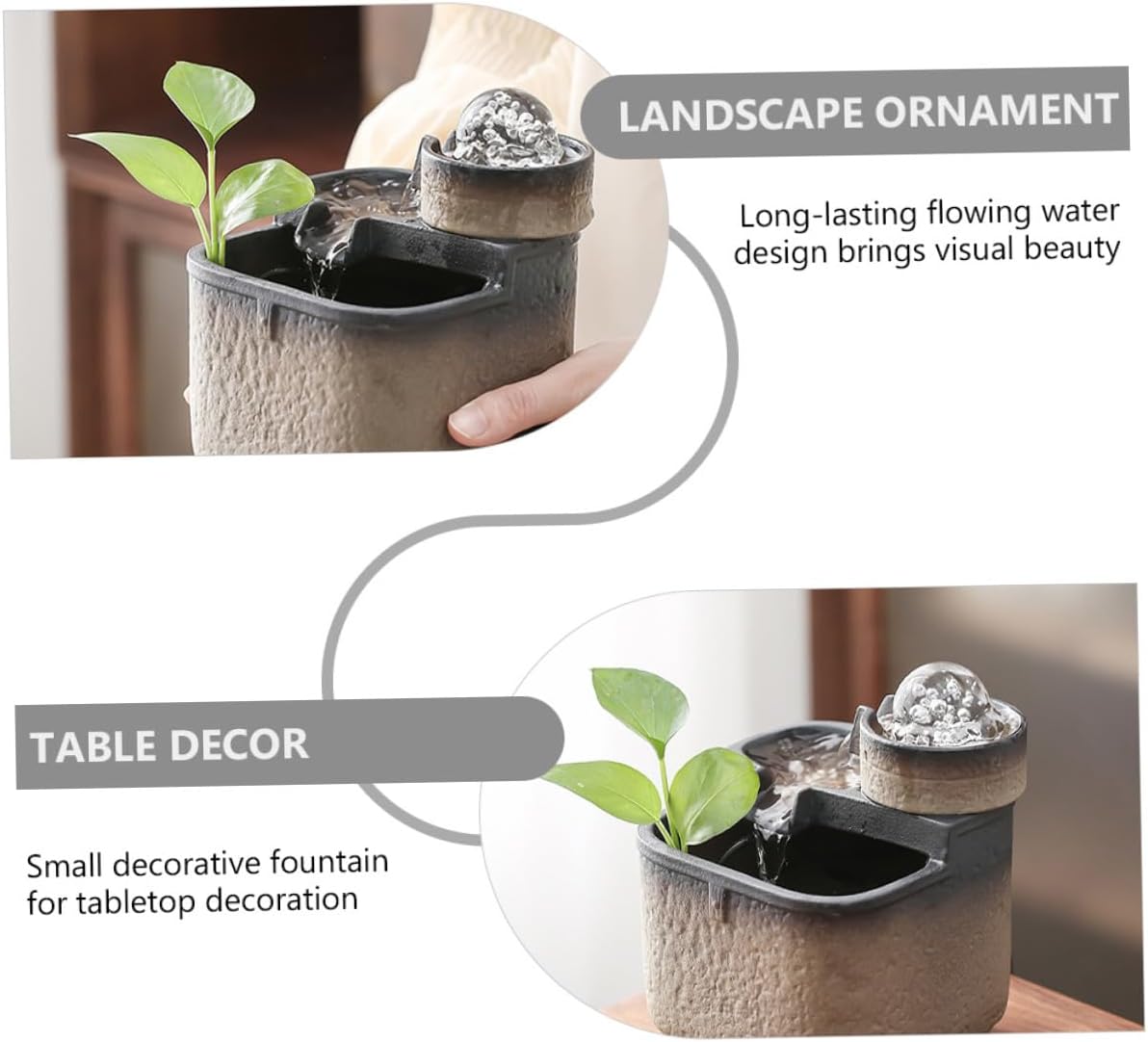 Package Include 1 x Flowing Water Decoration 1 x USB Plug Characteristics - Size: About 17.00X13.00X13.00cm/6.68X5.11X5.11in Fountain Adornment - Material: Ceramic Table Decor -Product Info:Ceramic flowing ornaments - It is a nice housewarming, birthday or New Year gift for your friends and family members Water Running Ornament. - Made of ceramic, very and reliable for a long period Office Ornament. - Suitable for bedroom, living room, restaurant banquet, etc Waterfall Adornment. - Small decorative fountain for tabletop decoration Desktop Fountain Decor. - flowing water design brings visual beauty, soothes emotions and reduces stress Landscape Ornament.Goods DescriptionDesktop Ornament It is made of , which can withstand the lasting use.Waterfall Adornment Are you looking for a delicate ornament for your desktop? Do you want an ornament which is creative and unique? If your answer is yes, you should come and take at this product.Desktop Decor The material enjoys the high durability, not easy to deform or break