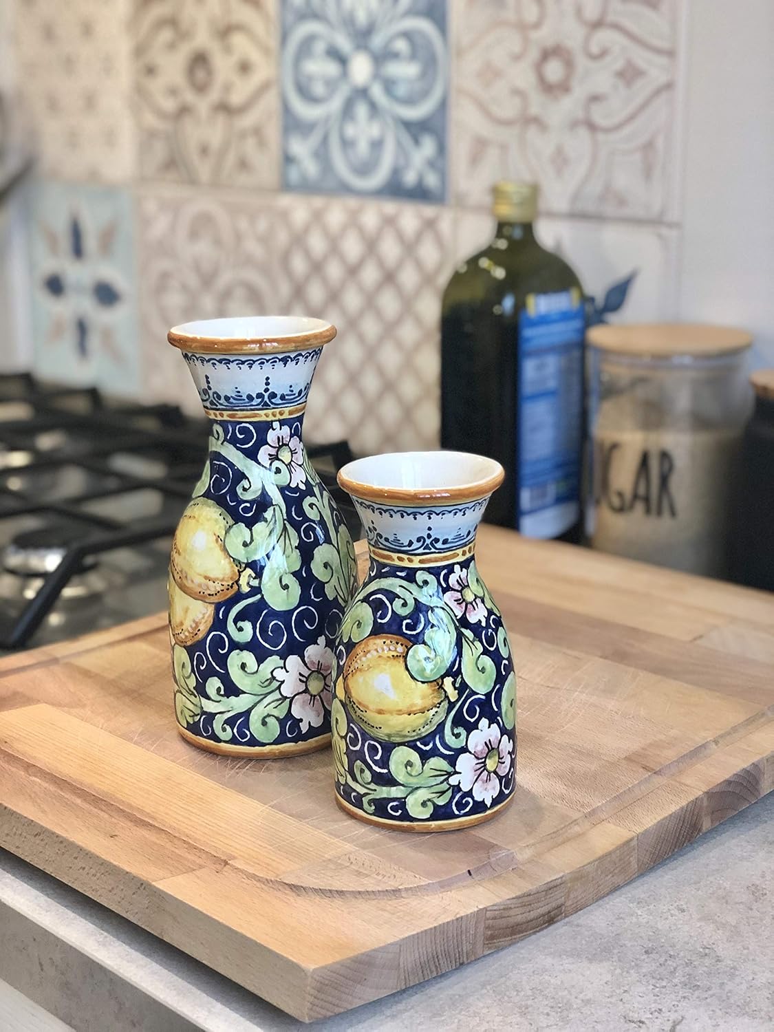PRODUCT INFORMATIONSet Jars set Vine,water or Vases for any useDecoration: Collection lemons blue background ; Branches of lemons , leaves, flowers, and curls on a completely deep blue background, yellow / orange borderDimensions: big jar 7,87 Inch x 3,93 Inch ,small jar 5.51 h inch x 2.76 inch Capacity approx big vase: U.S gal 0,066 Capacity approx small vase: U.S gal 0,132 PRODUCT INSTRUCTIONSAll our products are lead-free and can be used for foods . Dishwasher safe Do not use in microwave Do not use in oven