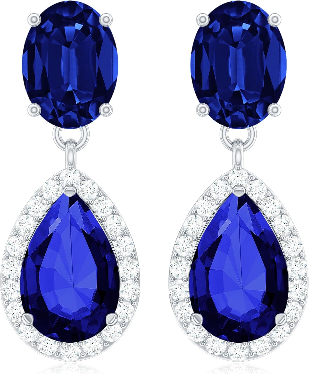 These dramatic Lab Grown Blue Sapphire Earrings are a treasurable piece of jewelry, which makes them perfect for your wedding day. As a dazzling Wedding Earrings For Bride, it is sure to take center stage with its classic and subtle sparkle. The beautiful pop of color Aaaa Quality Lab Blue Sapphire and D-Vs1 Quality Moissanite, has a standout, which is perfect for the bride who wants a bold look. Crafted from White Gold Plated Silver, these Wedding Drop Earrings are adorned with 6X8mm Pear Shape Lab Grown Blue Sapphire in Prong Setting with Moissanite Halo, set as a drop. To enhance the beauty of it is the 5X7mm Oval Shape Lab blue Sapphire on top. These gorgeous Lab Sapphire Drop Earrings are the bridal accessory, which are secured with Screw back closure. The exquisite craftsmanship and skilled artisans have made these drop style effortless, stylish with its subtle glamor, which is perfect for making the bridal sophistication or elegance. They are sure to add a pop of color to your ensemble.
