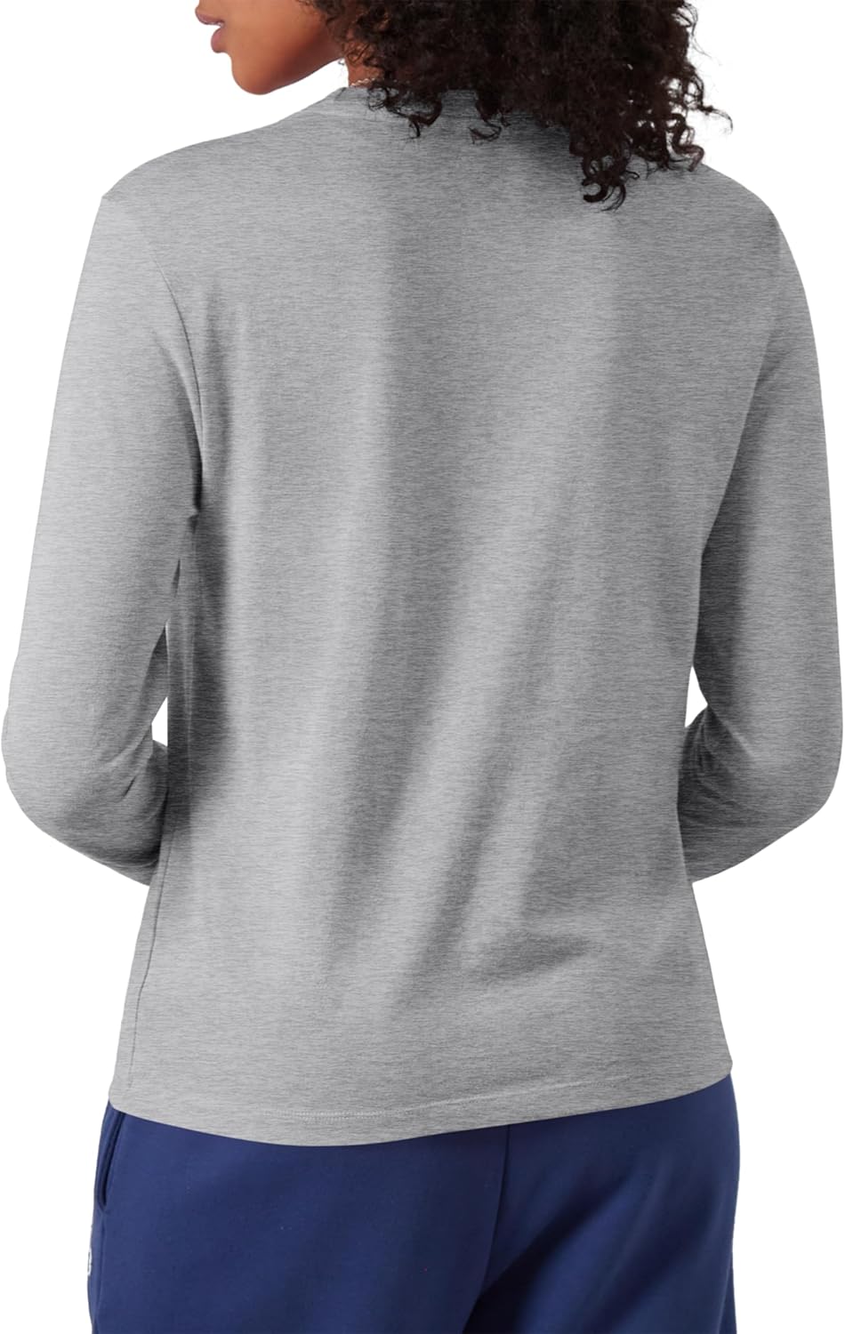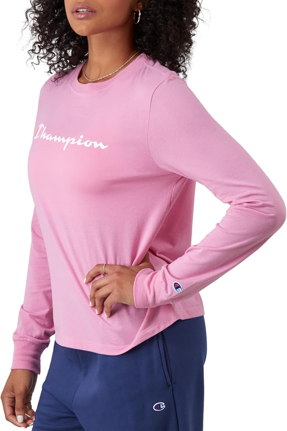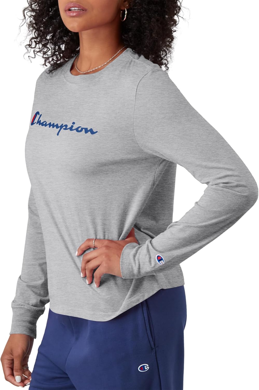 This long-sleeved version of Champion's® classic cotton-blend crewneck tee is a wardrobe essential. For layering under a hoodie, for throwing on over a tank, or for wearing on its own for a workout, this long-sleeve crewneck T-shirt is a great wardrobe expander. It has a classic fit that's not too tight or too loose, skimming easily over the body. This casual jersey tee is soft and easy, in a just-right weight blend of 4.5-oz. ring spun cotton and effortless polyester, offering the best properties of both fibers. Constructed for quality, this long-sleeve, cotton-blend tee is made with double-needle construction at the neckline and hem with a shape-holding ribbed crewneck and cuffs. The famous Champion® prints adorn this shirt with the C Logo appliquéd on the left sleeve. This long-sleeved crewneck tee definitely belongs in your T-shirt drawer.