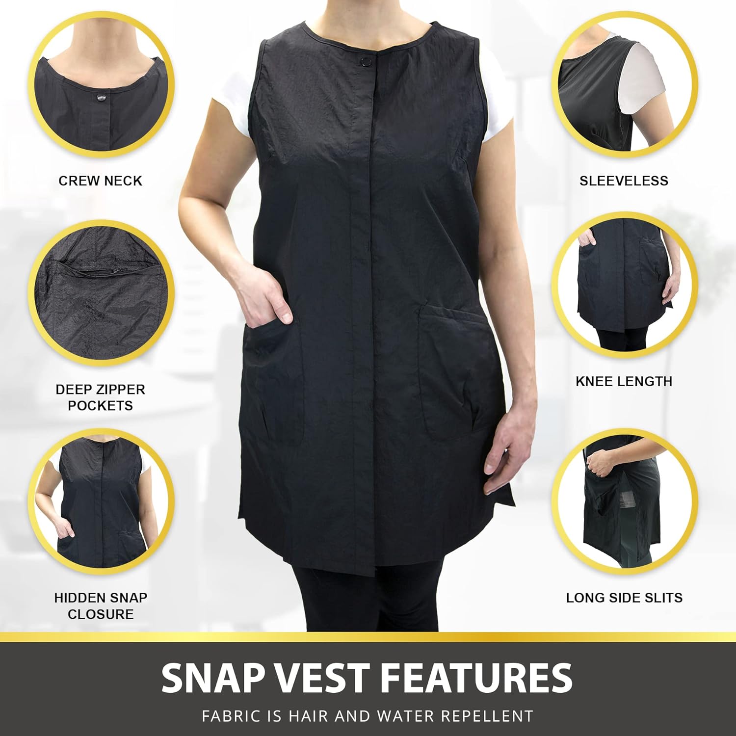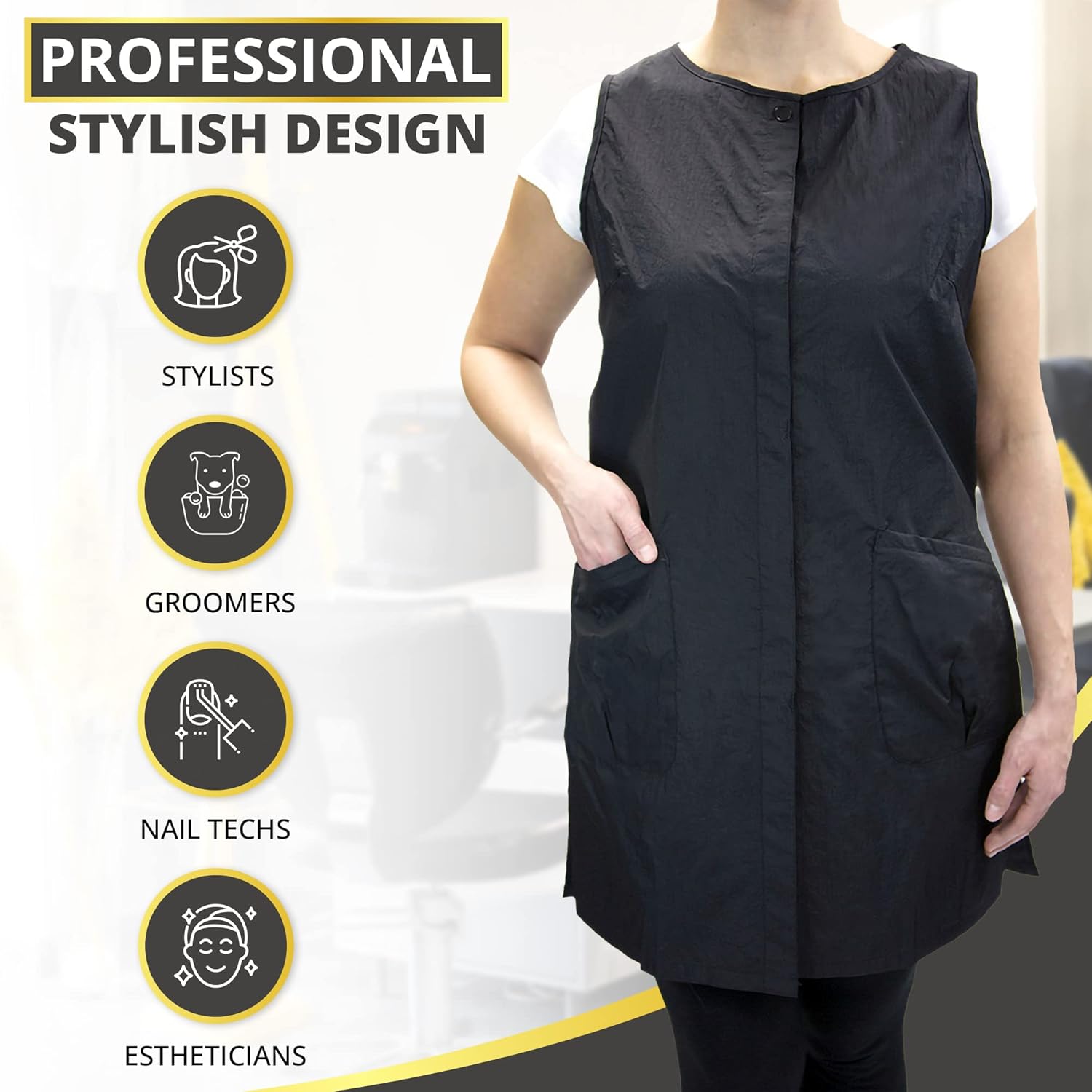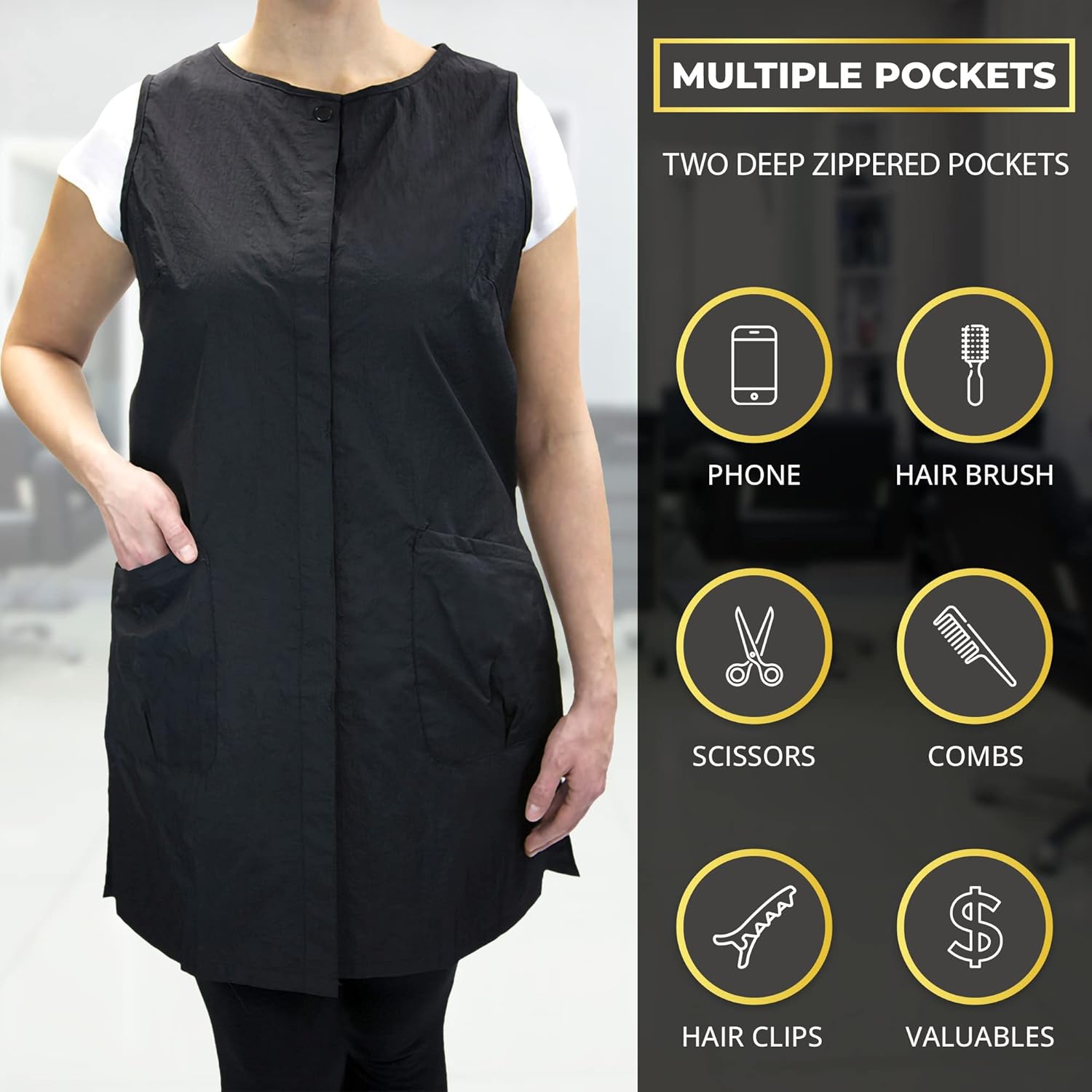 This high fashion salon wear is made from 100% breathable, woven crinkle Nylon Taffeta decorated with snap front closures and two zippered pockets on both sides. Order this stylist uniform in plain (blank) or with your choice of complimentary left chest logo embroidery. This stylist tunic is hair and water repellent and static free. This material is perfect for a stylist, designer, nail technician, barber, make-up artist, or skin care esthetician. May be machine washed in cold water and for best results, hang dry. This stylist wear is available in plus sizes and is popular among beauty schools, salons, and spas.