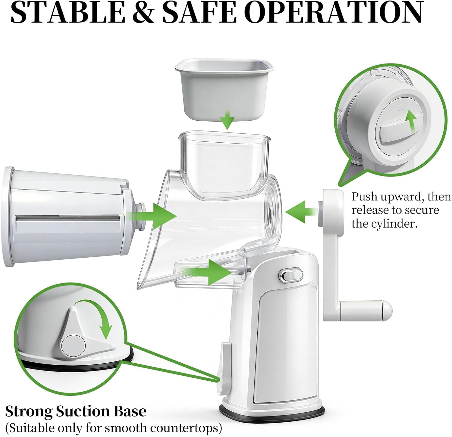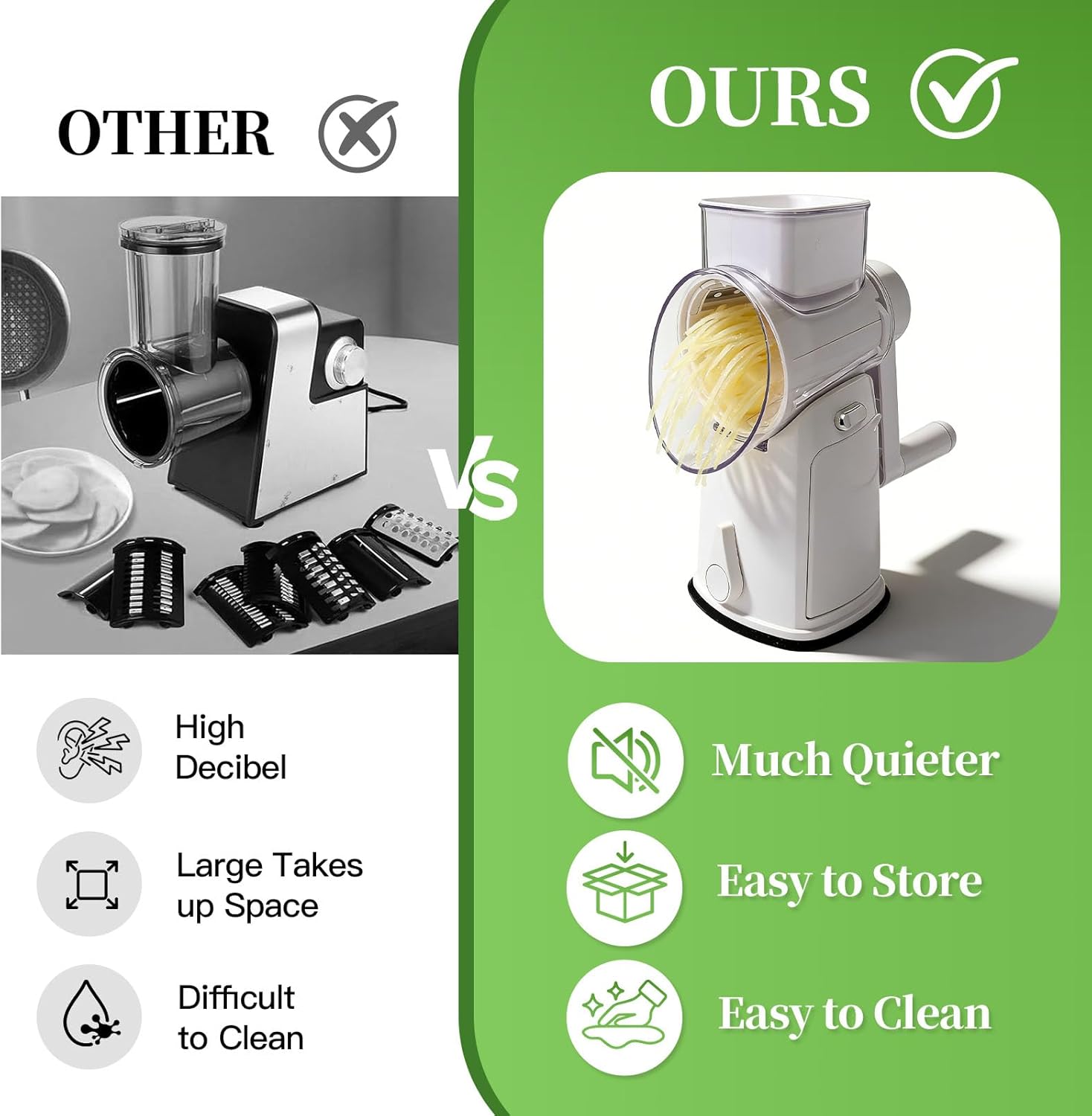 | Included Components | 2.5mm 420 Stainless Steel Slicing Blades*2, 2mm 304 Stainless Steel Fine Shredding Blades*2, 3mm Coarse Shredding Blades*2,Wavy Cuts Blades*2, 430 Stainless Steel Grating Blades*2, Rotary Cheese Grater with Hand Crank, Suction Cup |