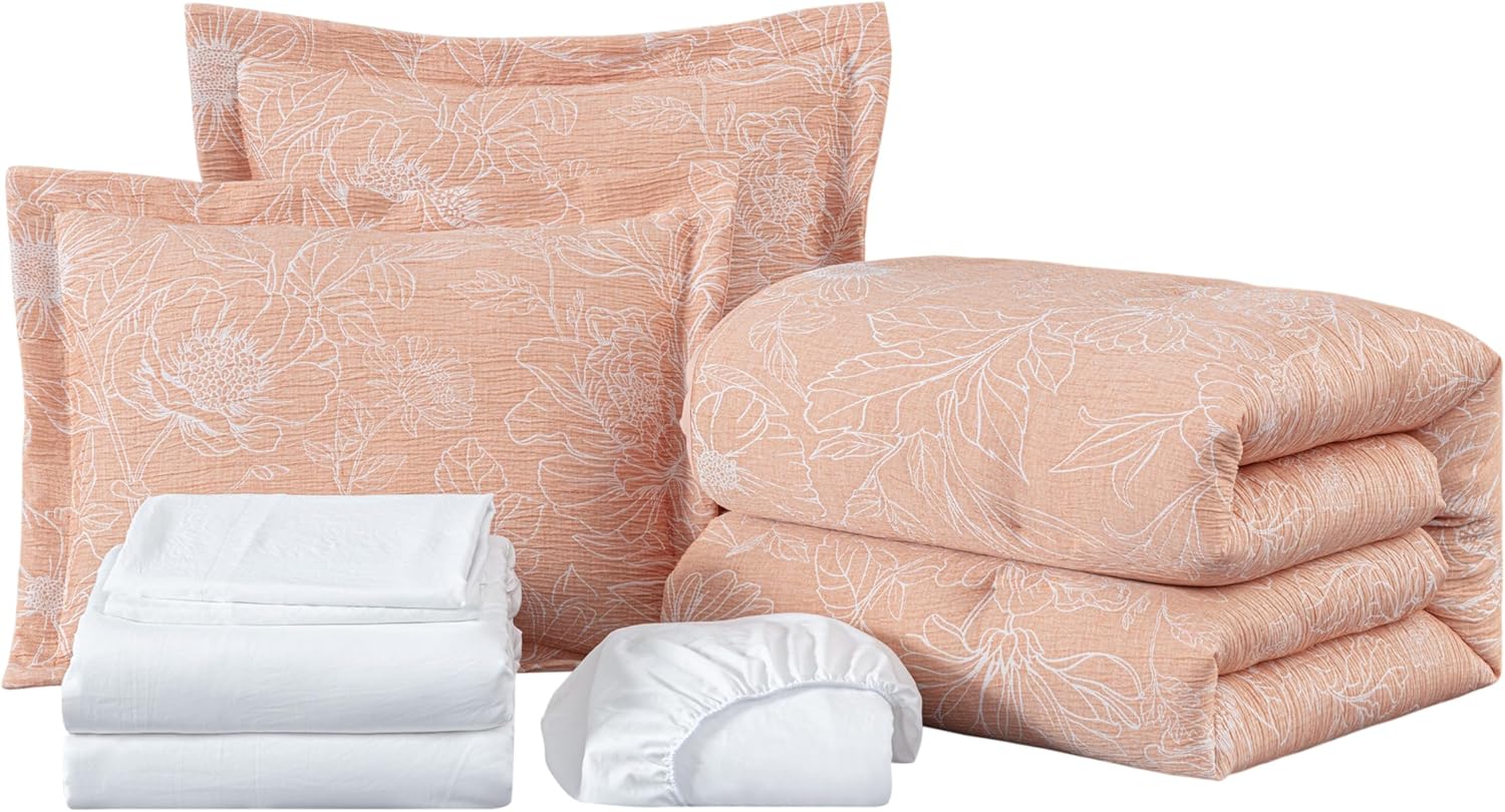 Introducing the Chezmoi Collection Isla Floral Bed in a Bag Comforter Set, where elegance meets comfort in every weave. Transform your bedroom into a sanctuary of style and relaxation with this exquisite bedding ensemble. Crafted with meticulous attention to detail, the Isla Floral Bed in a Bag Comforter Set boasts a stunning coral and white color palette, adorned with a delicate floral botanical pattern that adds a touch of sophistication to any décor. The soft jacquard textured fabric offers a luxurious feel, while remaining lightweight and breathable, ensuring comfort in all seasons. This set includes everything you need to complete your bedding ensemble: one comforter, two coordinating pillow shams (one pillow sham for twin size), two pillowcases (one pillowcase for twin size), one flat sheet, and one fitted sheet. The matching sheets are made of a brushed microfiber polyester fabric to ensure a soft and breathable comfortable nights' sleep. The fitted sheet has a deep pocket design that fits mattresses up to 15 inches deep, ensuring a secure and snug fit. Whether you're curling up for a cozy night's sleep or lounging in bed on lazy mornings, the Chezmoi Collection Isla Floral Bed in a Bag Comforter Set provides unparalleled comfort and style. Upgrade your bedroom décor effortlessly with the timeless elegance of the Chezmoi Collection Isla Floral Bed in a Bag Comforter Set. Perfect for your own master suite or as a thoughtful gift for a loved one, this bedding ensemble is sure to become a cherished staple in any home.