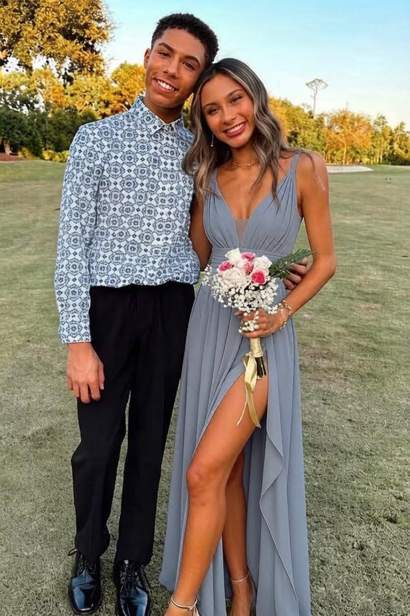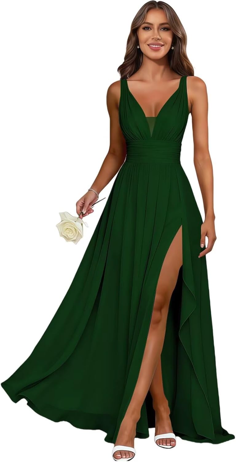 Chiffon Bridesmaid Dress Long Spaghetti Straps A Line V Neck Formal Evening Dress with Slit HOW TO CHOOSE A CORRECT SIZE of this Bridesmaid Dress? 1:Measure your waist ,bust ,hips size and compare with our own size chart. 2:If your measurements are between two sizes, please choose the bigger one. 3.We provide free customized service, just send your accurate measurements as follow. - Bust (the biggest circle of chest) - Waist - Hip (the biggest circle of hip) - Hollow to Floor - Natural Height without shoes - Heels Height