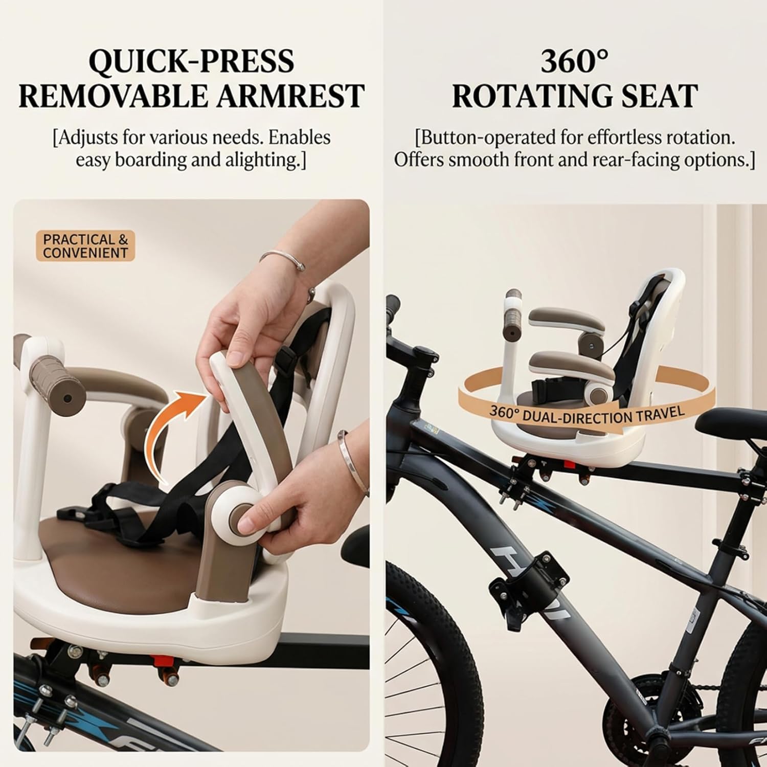 Child Bike Seat Front Mount 360° Rotating Baby Bike Seat with Adjustable Safety Harness and Soft Cushion Padding for Toddlers Ages 1 to 6, Front Mounted Kids Up to 50kg