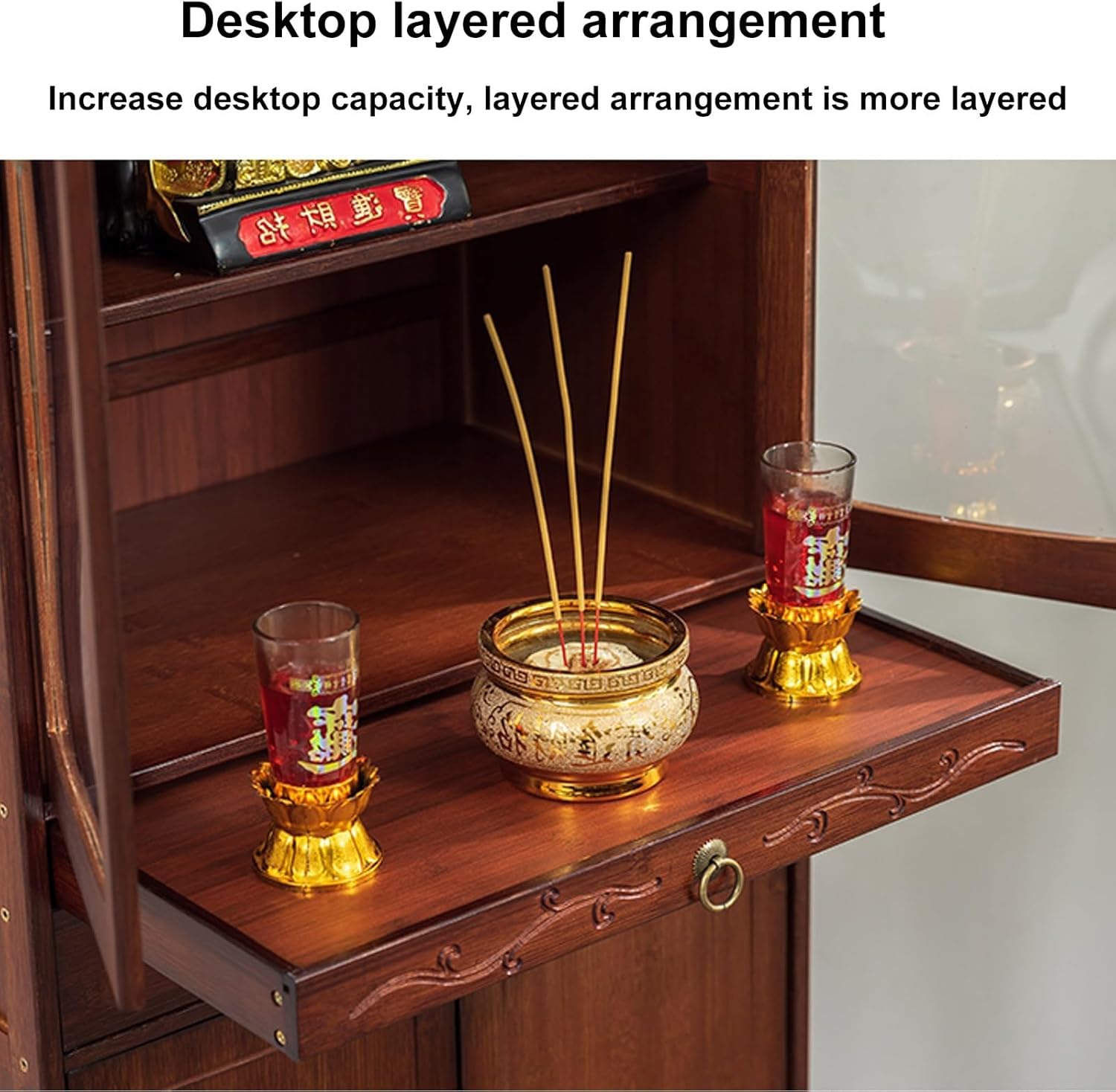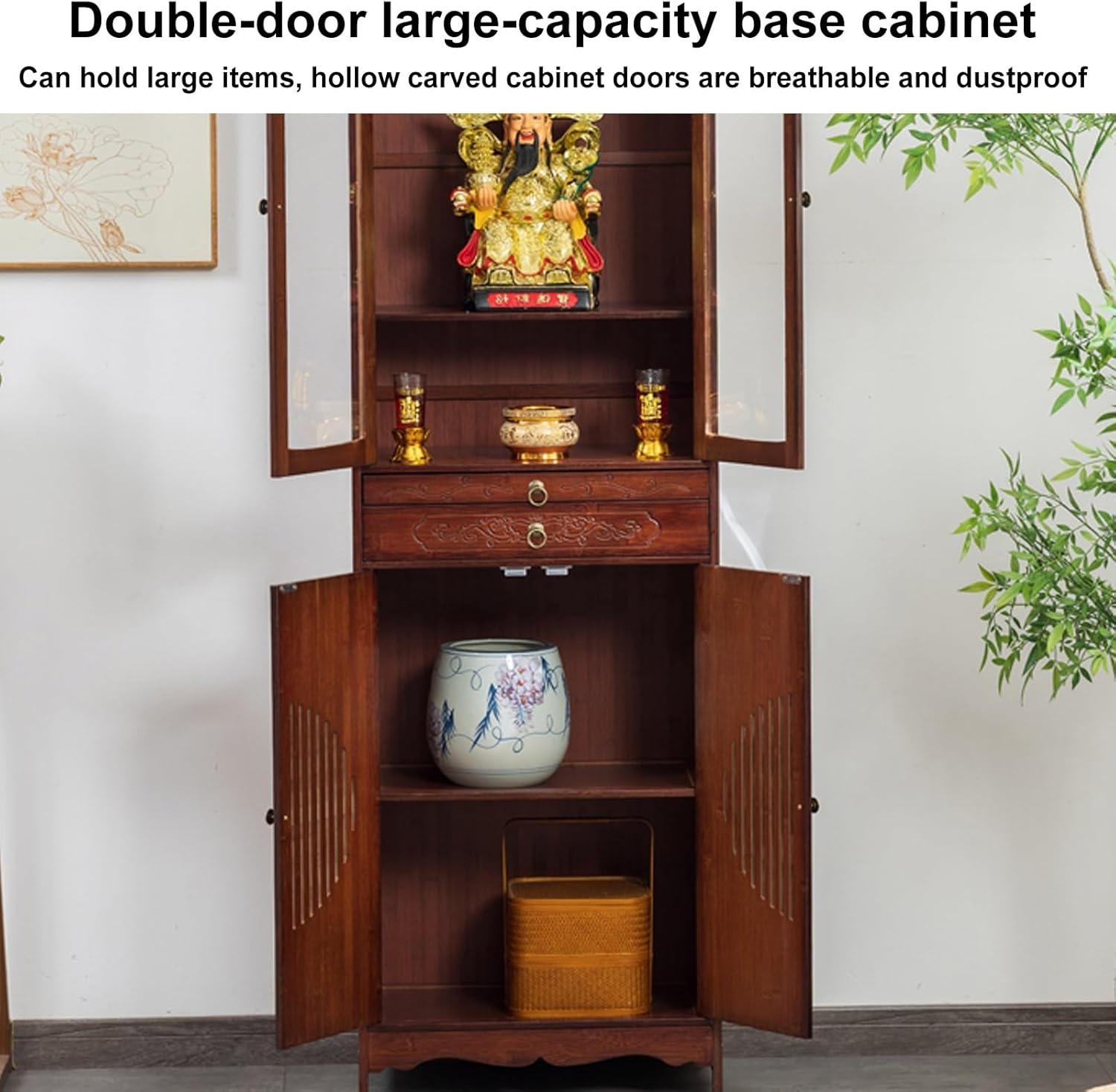 Chinese classical designThe family prayer altar is simple and solemn, with exquisite carvings and rich cultural charm, which conforms to the traditional worship customs and aestheticsPractical structure layoutThe meditation altar table cabinet can be used to place incense burners, tributes, shrines and other sacrificial supplies. Some styles are equipped with drawers or lower storage space for convenient storage of incense, candles, gold paper and other itemsProduct specificationsName:Buddhist Altar, Altar Cabinet, Prayer Altar, Personal Shrine Altar Table, Altar Table with Storage, Chinese Cabinet Pedestal Offering TableMaterial: NanzhuColor: Walnut colorStructure: Stable table leg design + built-in storage compartmentApplicable scenarios: family shrines, temple altars, meditation spaces, divination practice, Buddhist halls, ancestral halls, etcWarm tipsPlease confirm the size before purchasing. Due to manual measurement, there may be 1-3 cm error, please understandProduct images are for reference only and do not include other items in the display images