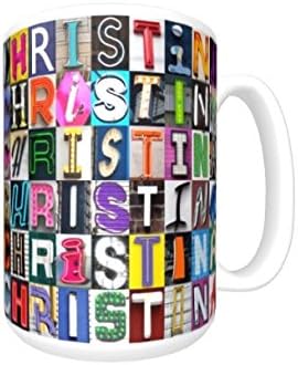 Personalized "CHRISTINA" coffee mug. The mug features CHRISTINA in photos of sign letters showcased on both sides of mug. The mug is dishwasher and microwave safe and meets all FDA standards for safety and toxicity. Orders shipped directly from the printer typically within 2-3 business days.