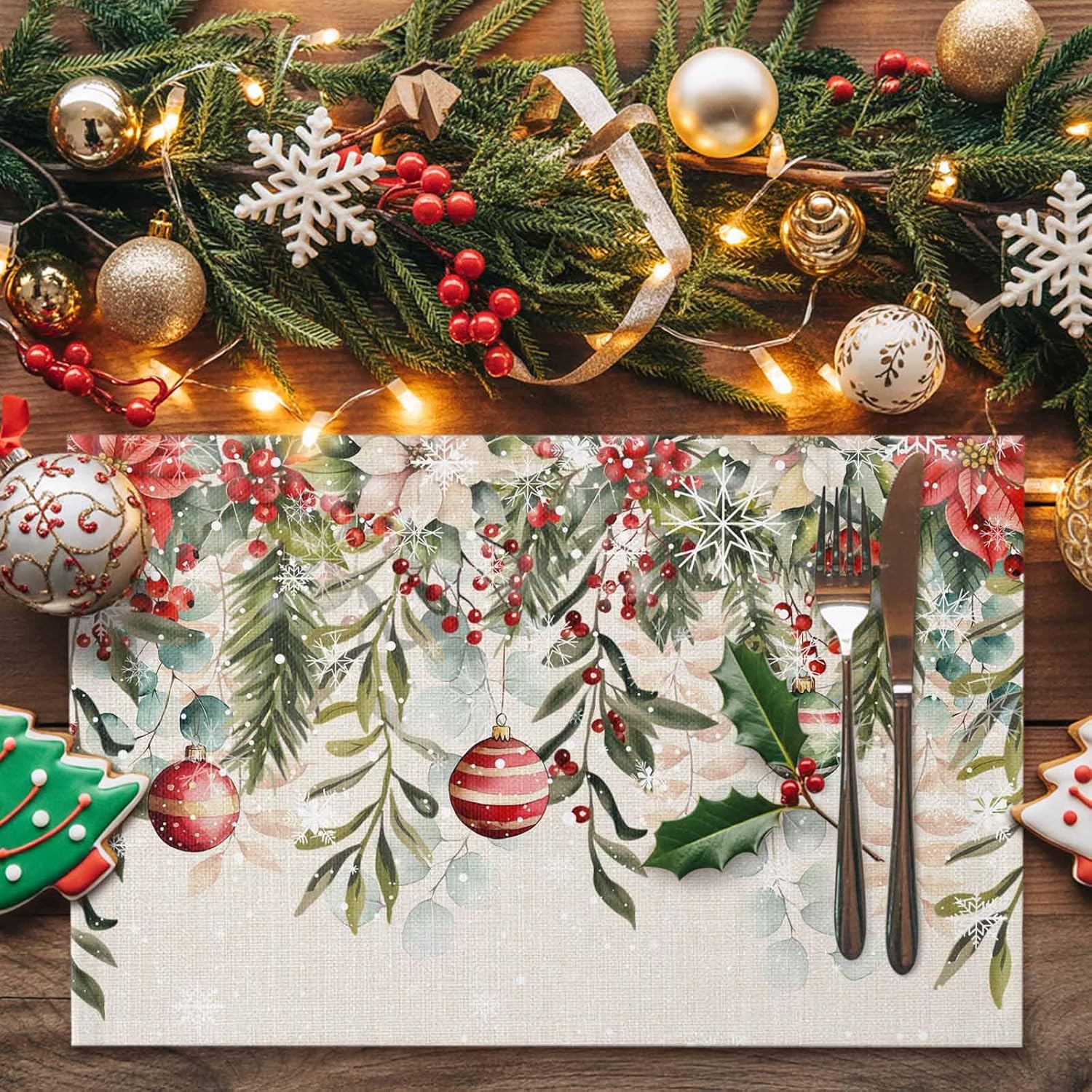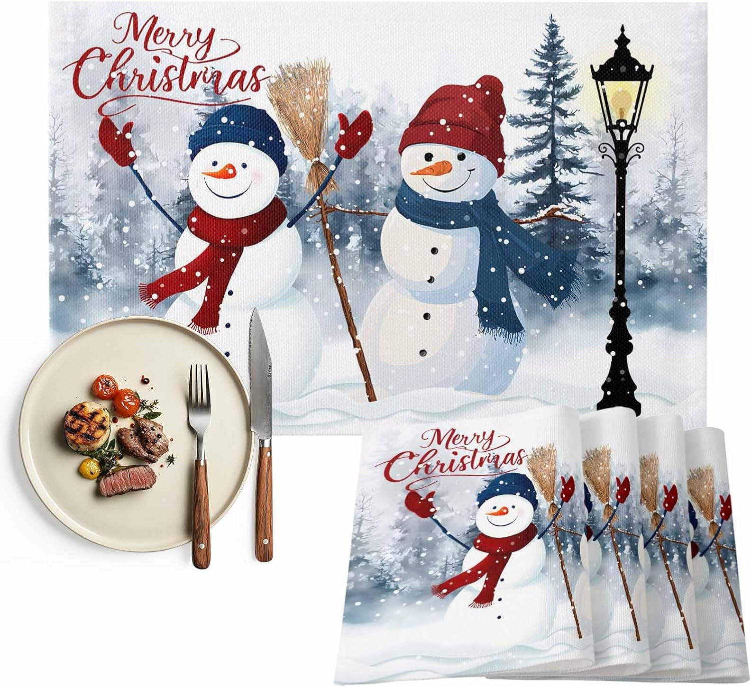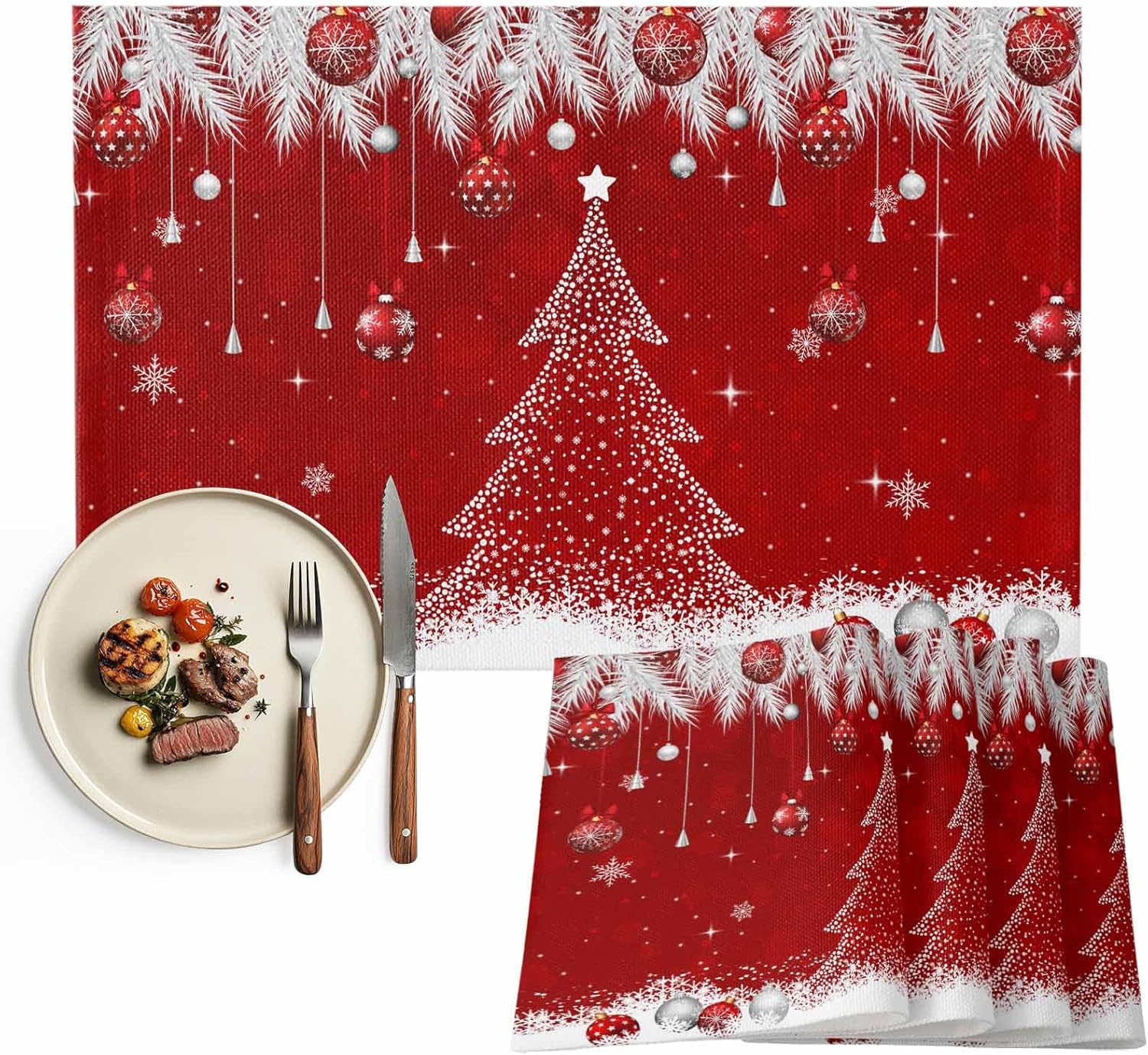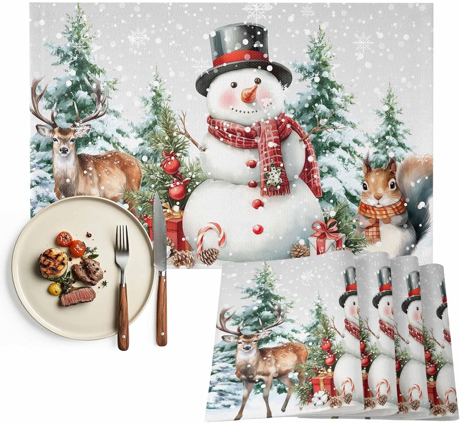 Christmas Placemats fo Dining Table Features: Made of polyester and cotton linen material, skid resistance ,heat resistant and durable. Vibrant color and perfect texture. Not only do they protect a tabletop placed anywhere, but they're also stylish, making them an eye-catching kitchen or dining table decoration! Christmas themed pattern are unique and beautiful, with brightly colored snow scenes and Christmas trees. When you eat a lot, the tabletop gets messed up. Luckily, there are placemats to protect your table or bar from cutlery wear! They look more luxurious and are more comfortable to use. We believe that placemats are an integral part of your dining table. Perfect for dinner table, good match with glass table, white dining table, wooden farmhouse table, brown dinning table. All of placemats are in one size: 13x19 inches Placemats are cut by hand and maybe one or two inches error. Tips: Due to different monitors, the picture may have a slight color difference. If you have any issue upon receiving the item, please contact us immediately. We will respond as soon as possible.