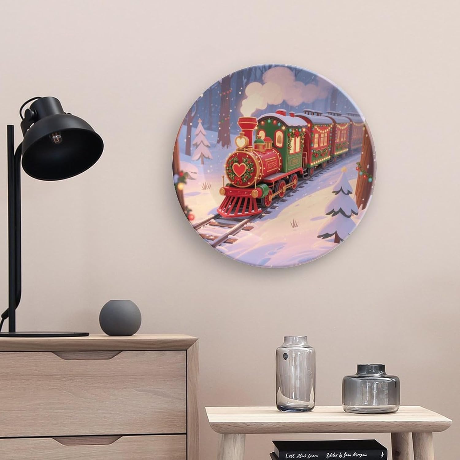 Our ornament is made of bone China material, which is sturdy and durable, and the surface is smooth and does not cut hands. Versatile to decorate your space or serve as a dinner plate. Microwave & dishwasher safe. Sturdy, fashionable at the same time, safe for everyone to use. This Christmas Train disc decoration comes with a display stand, which can be displayed in a porcelain cabinet, shelf arrangement or side table. It can be placed three-dimensionally, placed on the table with the base, or hung up, easy to disassemble, both decorations are very beautiful. It is a beautiful landscape. Perfect for daily use in homes, kitchens, houses, offices, cabinets, walls, banquets, or exhibition halls, it looks very elegant and artistic, bringing vitality and color to your space. As a beautiful gift for lovers, friends, and family on special occasions or holidays such as valentine's day, mother's day, father's day, halloween, and christmas.