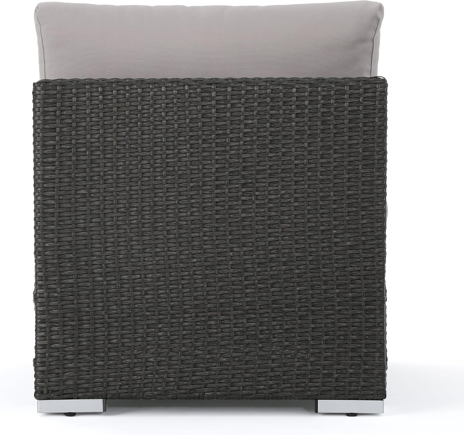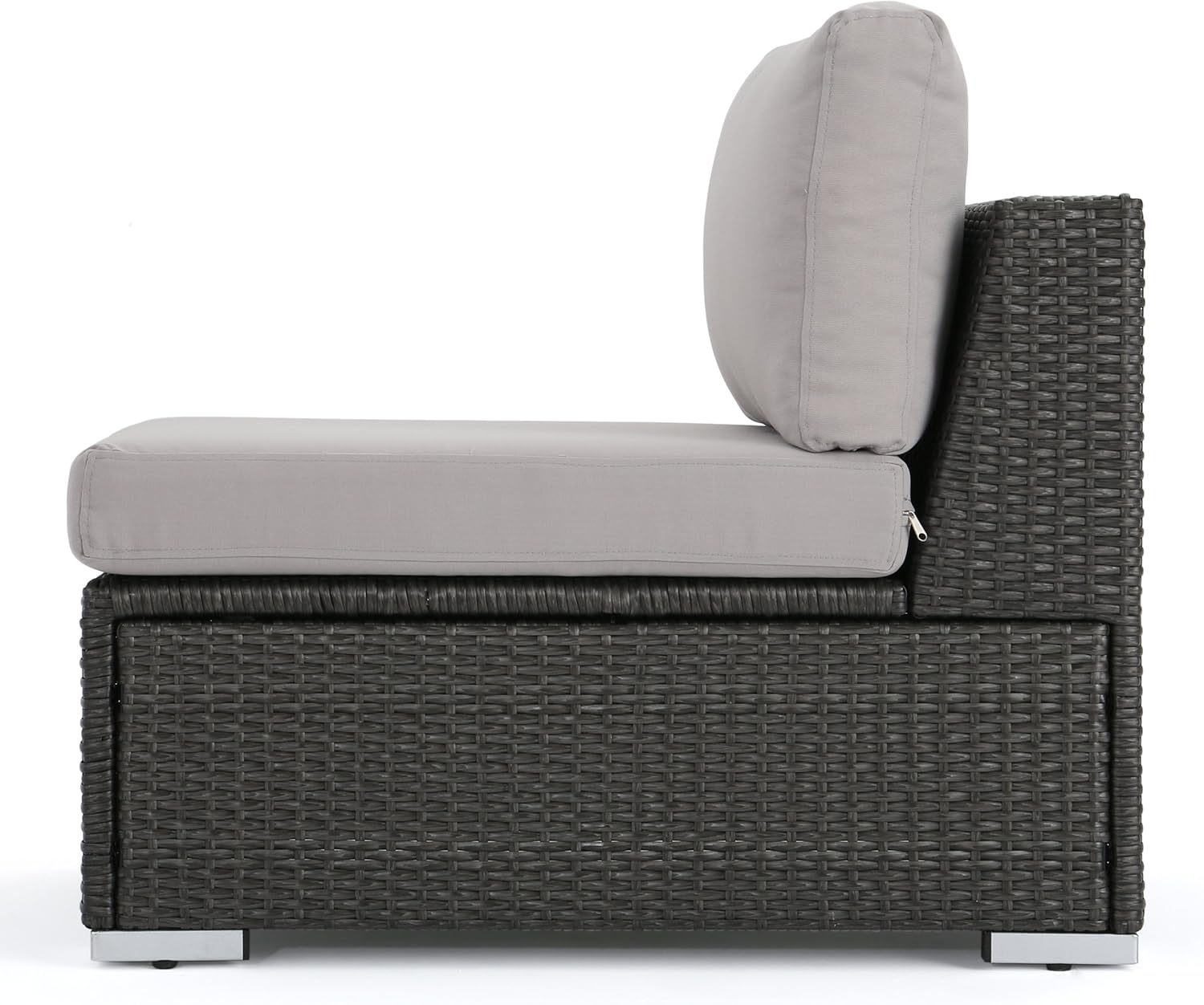 Looking to expand your sectional sofa a couple of chairs? This set includes one armless sectional sofa seat, Perfect for making your sectional The little bit longer that you have been hoping for. Made with top quality wicker & Complete with extra plush water resistant fabric cushions for maximum comfort, these chairs are just what you have been looking for to expand your outdoor sectional couch. Product details Includes: one (1) armless Chair Material: Polyethylene wicker cushion material: Water resistant fabric composition: 100% polyester Frame material: aluminum wicker finish: Grey cushion color: Silver Assembly required Dimensions: 33.25"D x 22.50"W x 24.40"H Seat width: 22.50" Seat depth: 26.00" Seat height: 12.10".