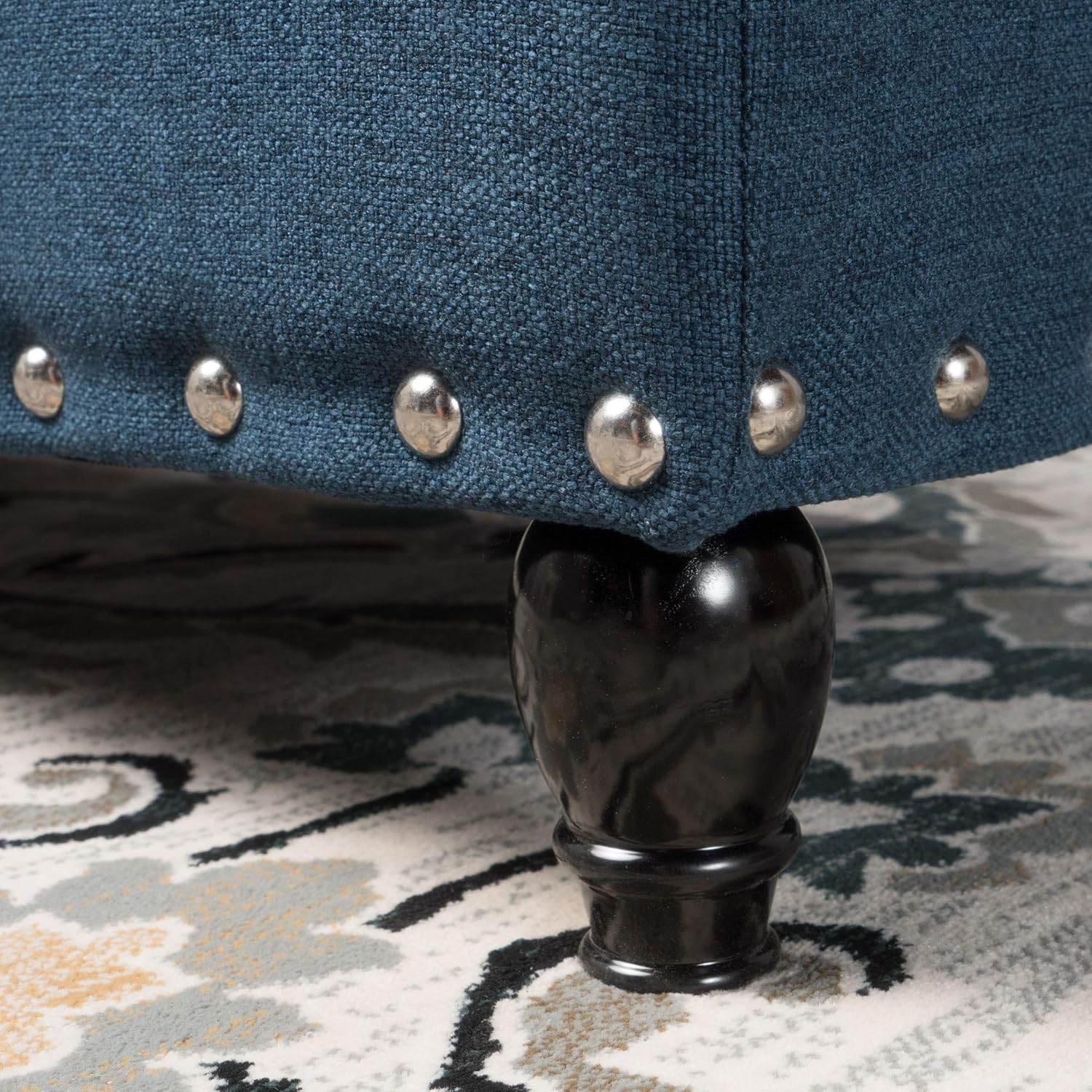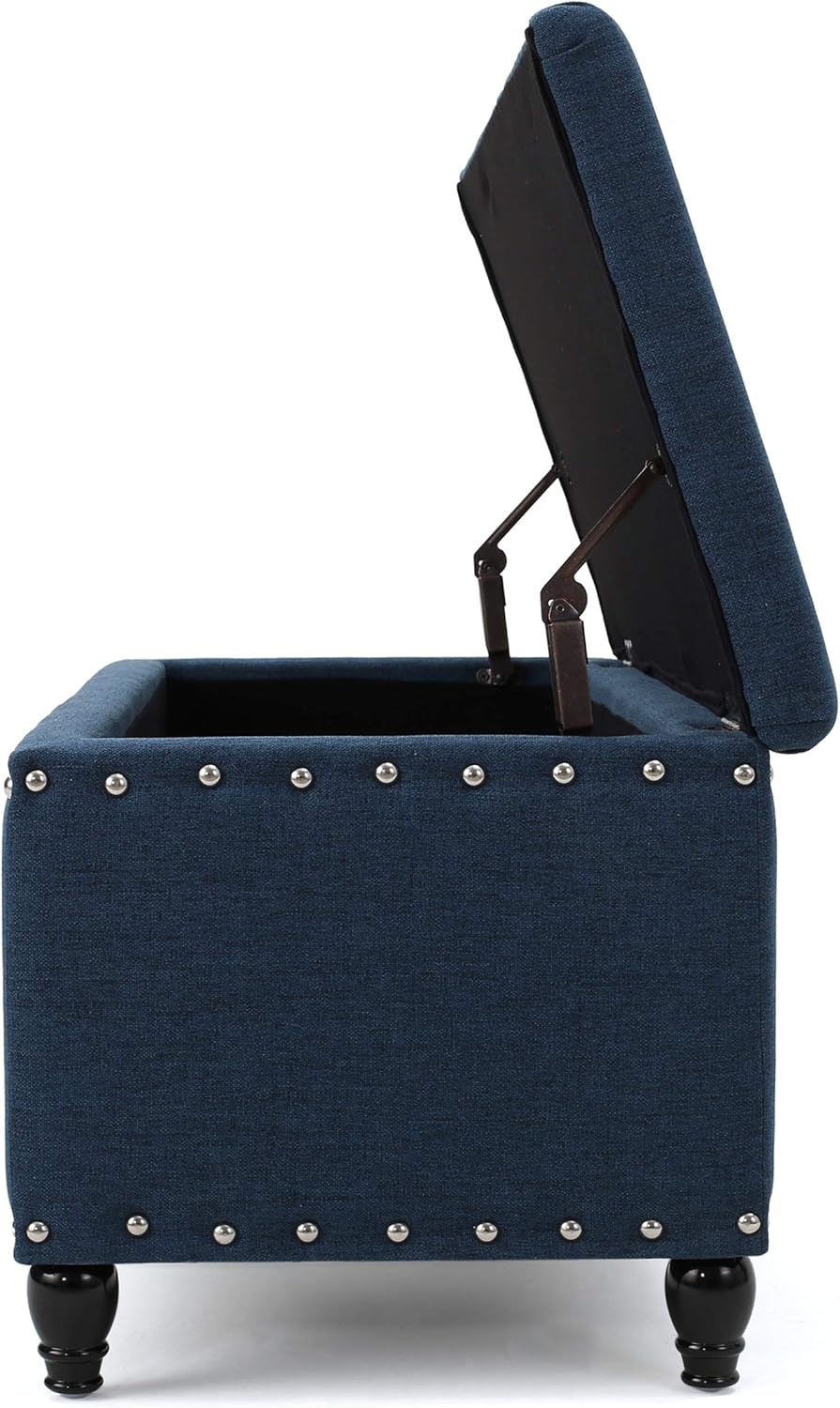This storage ottoman is ideal for any space in your home. Featuring beautiful stud work around the entire piece, this ottoman enhances any room while providing extra storage for your home. With traditional legs to complement any décor, this ottoman is perfect for any room in your home. Includes: One (1) Storage Ottoman Material: Fabric Fabric Composition: 100% Polyester Leg Material: Birch Color: Deep Blue Leg Finish: Dark Brown Light Assembly Required Dimensions: 18.25”D x 42.00” W x 18.25” H