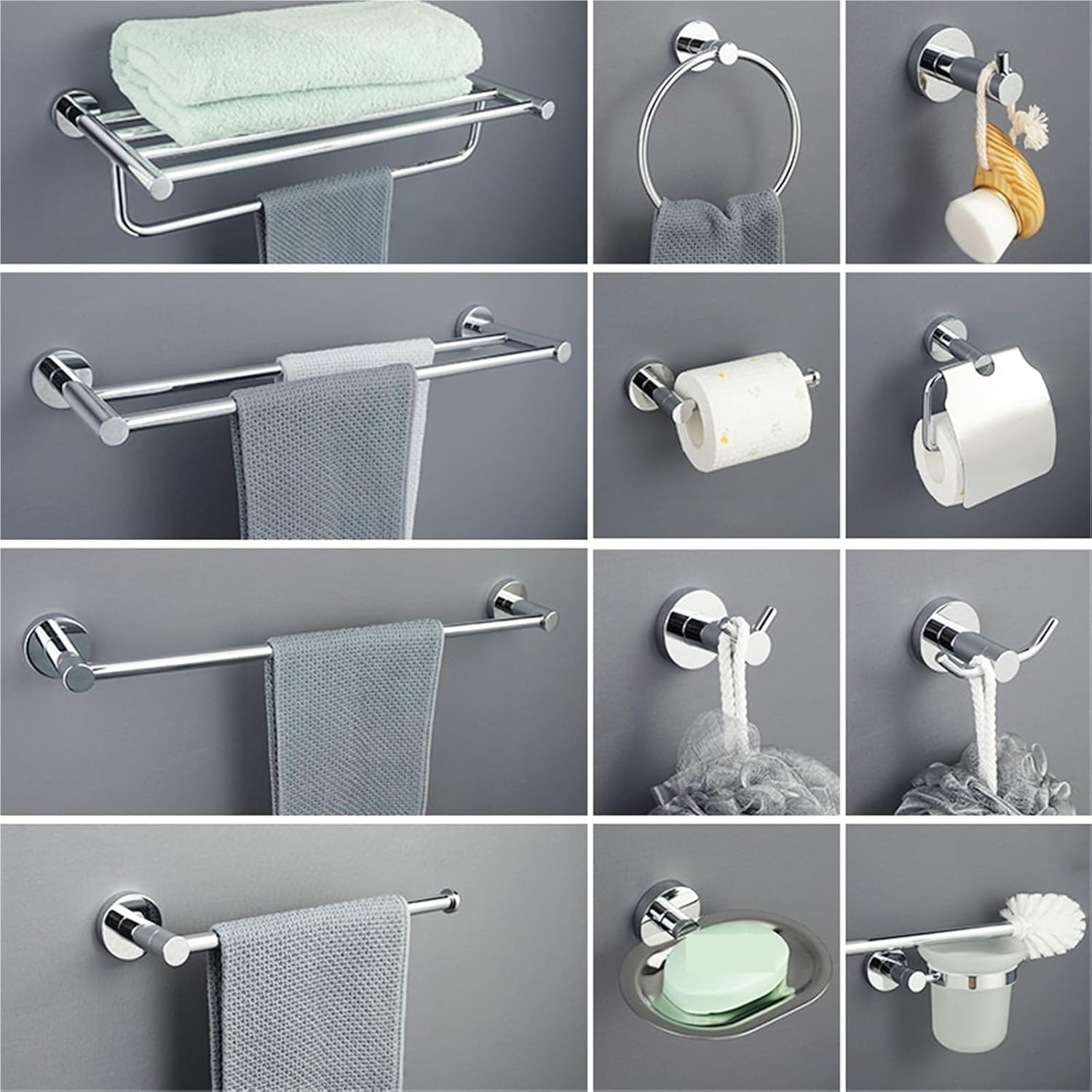 Bathroom ShelvesChrome stainless steel bathroom accessories towel rack soap tray robe hook towel loop wall roll paper holder toilet Features and Specifications:Material: 304 Stainless SteelUsage: bathroom/shower/toilet/toilet/toiletcolor: ChromeType: Bathroom AccessoriesInstallation method: wall-mountedBathroom Accessories Set:Towel Rack / Towel Bar / Toilet Holder / Paper Hanger / Soap Dish / Soap Dispenser / Tumber / Cup Holder / Robe HookAll mounting accessories included==========Installation Method : AssemblyBath Hardware Set Finishing : ChromeModel Number : MLCSurface Finishing : Mirror PlatedMain Material : MetalMaterial : SteelType : Bath Hardware SetsCategory : Bathroom AccessoriesMaterial : 304 Stainless SteelApplication : Bathroom / Shower Room / RestroomInstallation : Screw Wall MountedColor : Chrome