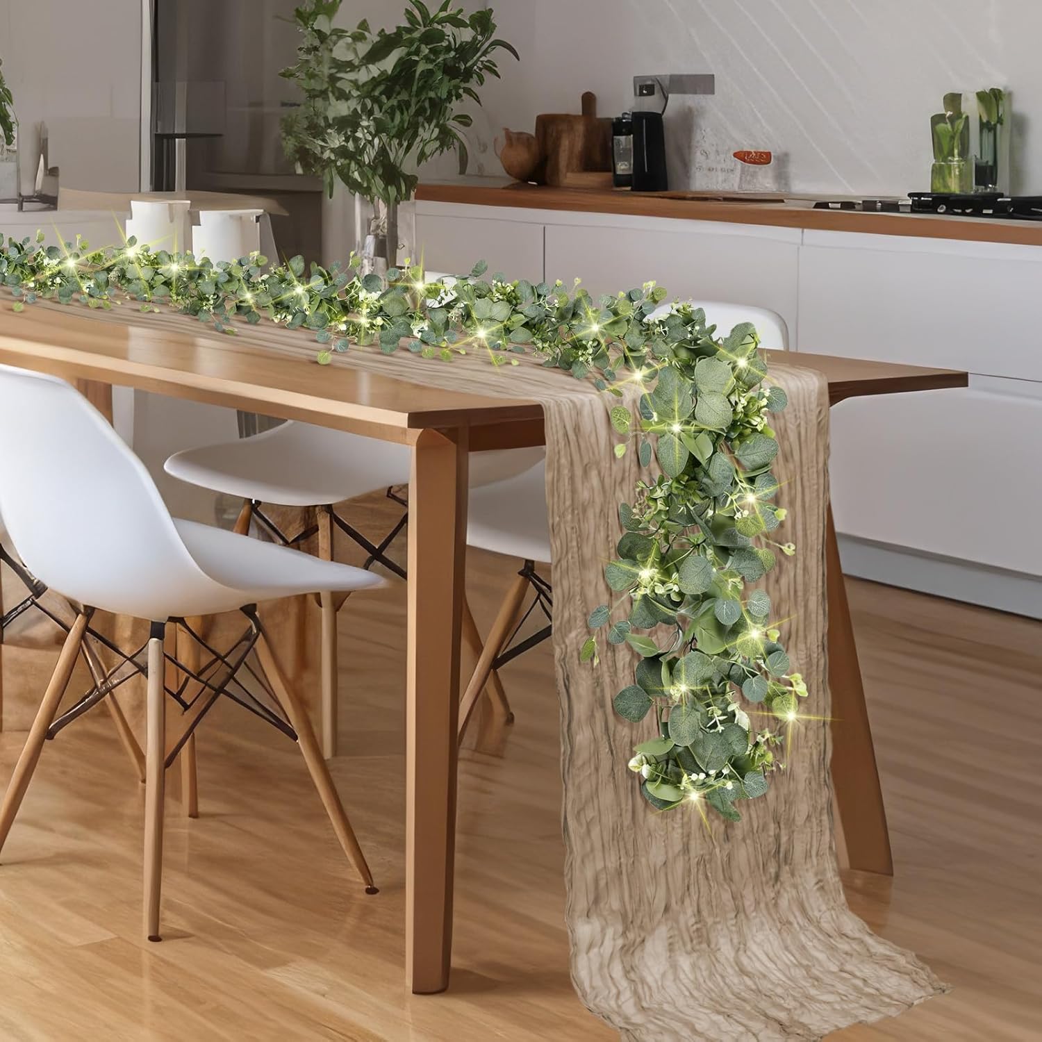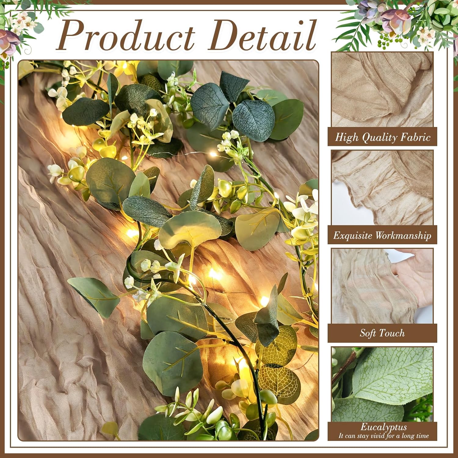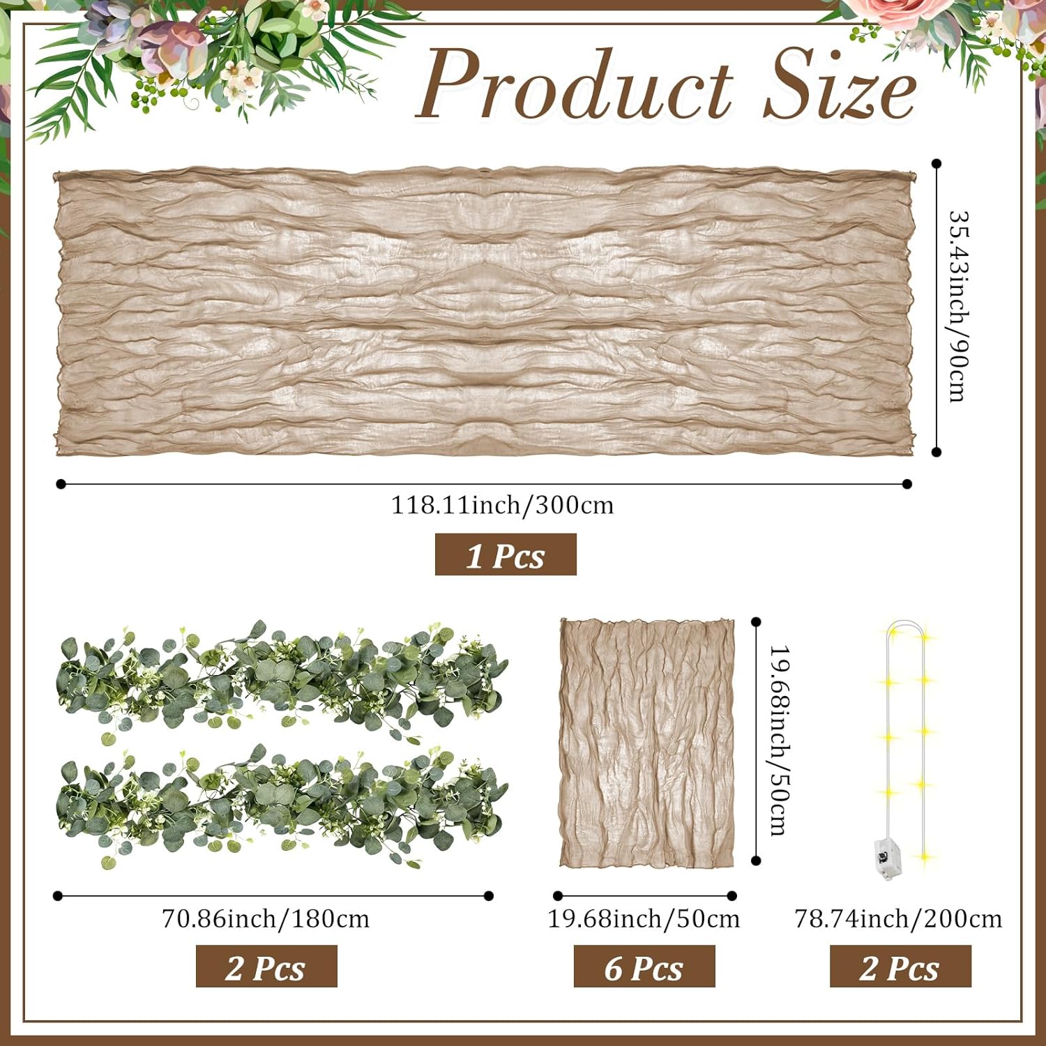 Features: Elegant Boho Table Setting Kit: This complete table decoration set brings a naturally soft and rustic charm to weddings, baby showers, parties, and home dining. The flowing cheesecloth tablecloth pairs beautifully with matching napkins, eucalyptus garlands, and warm lights, allowing you to easily create a romantic and inviting table atmosphere. Perfect for boho decor, rustic weddings, holiday gatherings, and everyday dining enhancement. Specifications: Material: Polyester cheesecloth, faux eucalyptus, LED string lights Color: Sage green, natural green warm white Tablecloth Size: 120 inches / 300 × 90 cm Napkin Size: 20 × 20 inches / 50 × 50 cm Eucalyptus Garland Length: 70 inches / 180 cm each Light String: Warm LED Package Includes: 1 × Cheesecloth tablecloth 6 × Cheesecloth napkins 2 × Faux eucalyptus garlands 2 × LED string lights Notes: Hand wash recommended; air dry only to maintain texture. Slight color variations may occur due to manual dyeing. Keep lights away from water.
