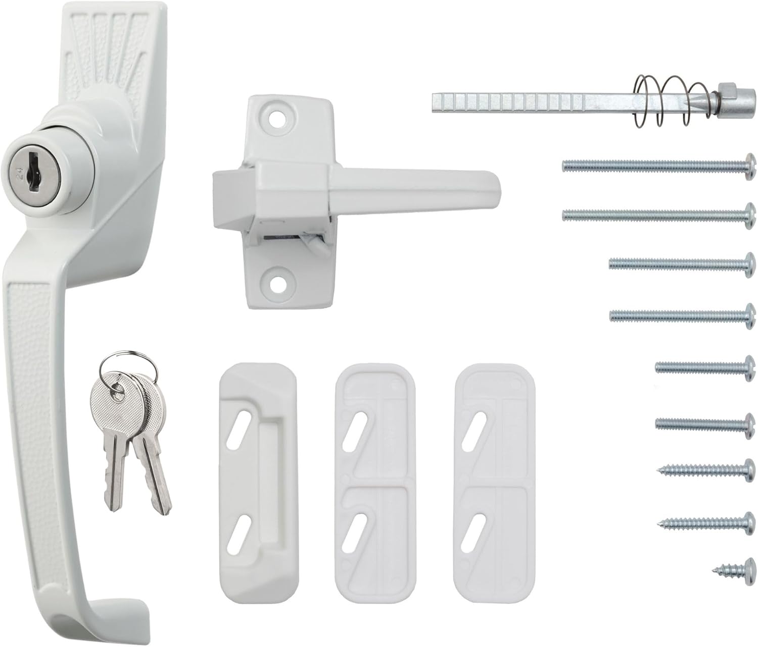 Product Description Designed for storm doors and screen doors with a thickness of 1” to 2”, Ideal Security’s Classic Push Button Handle with Key Lock series is an ideal surface mount screen door handle replacement kit that offers both form and functionality. With the push of a button, your out-swinging door will be readily accessible. The integrated keyed door handle lock and included inside latch act as a storm door lock, providing a layer of security to prevent unwanted opening of your door. This handle is ideal for replacing previous handles with screw post distances of 1 ¾". If the screw post holes in your door are not 1 ¾" apart, or in the case of a new installation, holes may need to be drilled into the frame of your door. Ideal Security has been supplying quality hardware to door manufacturers since 1956. Please explore our other door and window hardware products for your home. From the Manufacturer White storm door keyed push button handle set. Includes inside and outside handles and mounting screws.