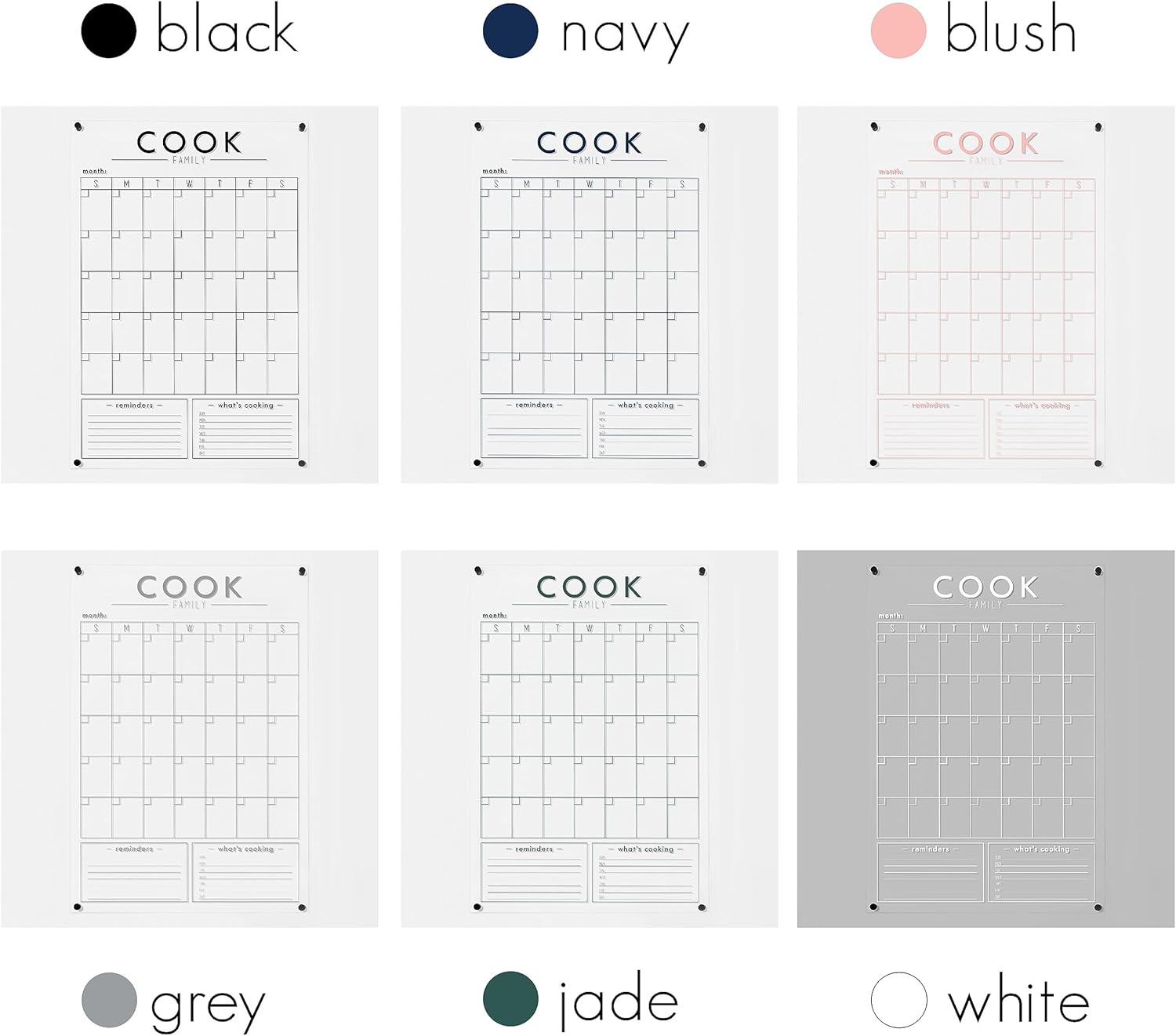 Personalize this Dry Erase Acrylic calendar with your family name up top and any titles you want for the bottom boxes. Create something as unique as your family to hang on your wall! This calendar is clear acrylic with the calendar design printed in the color of your choice on the backside of the acrylic.When I custom make your acrylic wall calendar, it's professionally printed on the back...aka it's not a vinyl / sticker :) It will last forever and never rub off! Perfect for adding a modern and chic feel to any room. These dry erase calendars are a memorable gift too!PRODUCT DETAILS Please note that this design will always be made with an “UPPERCASE” title and all lowercase side section titles for aesthetic reasons - unless a customer specifically requests otherwise with "use Title Case, lowercase, UPPERCASE, etc)" instructions on their order. - Customized with your last name on top and custom titles for the bottom sections - Acrylic is a high quality, guaranteed defect free, 1/4" thick acrylic Calendar day squares size:- 18.5" x 23" Calendar Size - approx 2.3” W x 2.3" H - 23" x 31" Calendar Size - approx 3.2” W x 3” H - 26" x 38" Calendar Size - 4” W x 3.6” H Custom section ideas: children's names, chore/task chart, notes & events, to-do list, grocery list, weekly menu, week goals, priorities, reminders. PLEASE NOTE- Every calendar ships with a clear protective film. It is completely normal for this protective film to have some scratches on it as we handle cutting you calendar and printing on it in our shop. After hanging, you will remove the film and the calendar will look perfect.