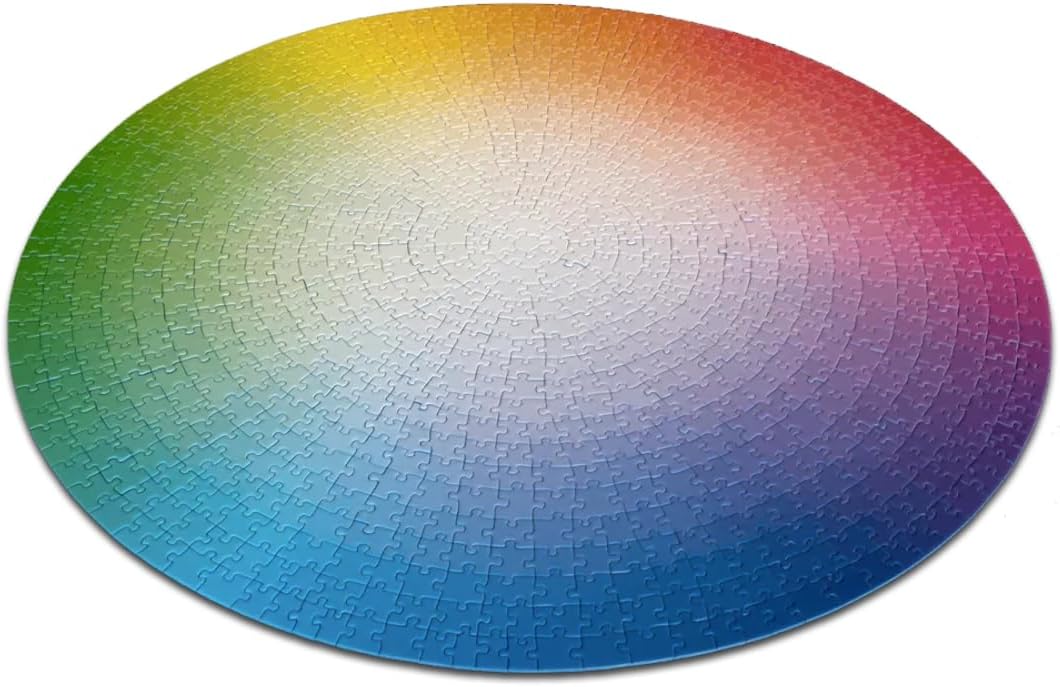 This 1000 piece wheel jigsaw puzzle features CMYK colors. Each tile is an individual colour. The hues are arranged in a circle with colors around the outside edge with saturation progressively decreasing towards the centre. The 1000 piece wheel jigsaw puzzle will measures 26.6" diameter when it is completed. Made in Germany with a new linen-textured finish and soft-click technology.