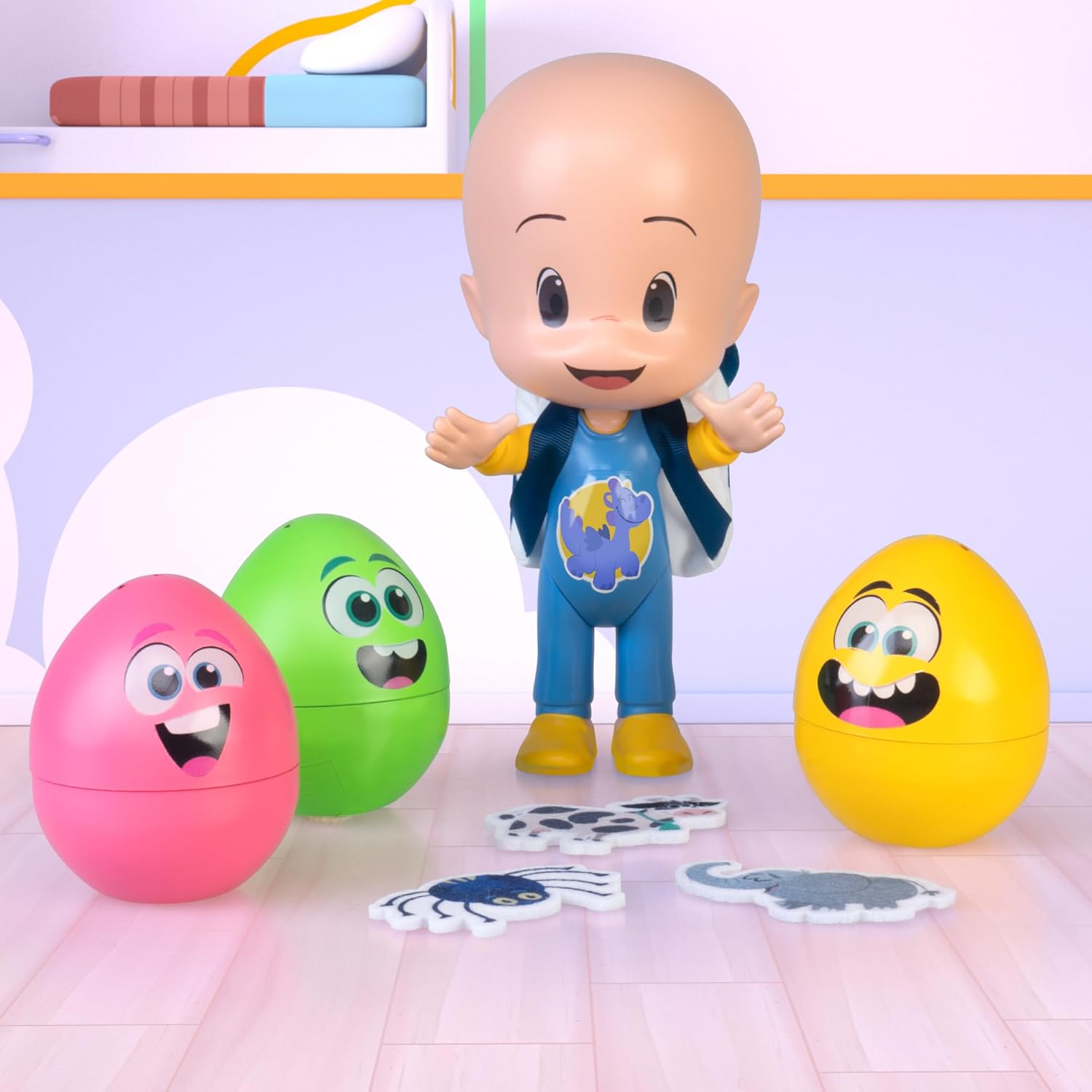Cuquín and the eggs surprise is a vinyl doll with 3 surprise eggs, where you will be able to find 3 animals inside and 1 textile backpack to carry them. Officially licensed Cuquin product. 20 cm doll with articulated arms and legs. For children over 2 years old.
