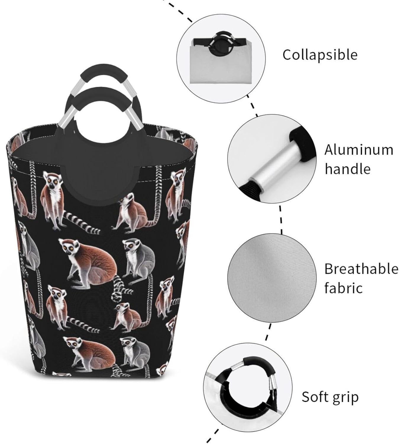 Our Clever lemur dirty clothes storage bag is made of polyester, which is lightweight and flexible. It can maintain a stable shape even under heavy pressure and collision. At the same time, the incorporation of Oxford cloth material significantly improves the durability of the product, and it is resistant to wear, bumps and pulling. The storage bag is designed with a large capacity, which can easily carry winter clothes, daily clothes and a variety of sundries. It is easy to carry and store, and fits tightly into the gap of the suitcase after folding. The aluminum handle is sturdy and reliable, supports hanging, and is suitable for a variety of places. In terms of design, it adopts leak-proof technology, combined with waterproof coating and precision sewing, which is effectively waterproof. The exterior uses cutting-edge transfer technology, and a PE board support is added at the bottom to ensure stable load-bearing and prevent tipping. This storage bag is practical and easy to use, and is an ideal choice for travel and home.