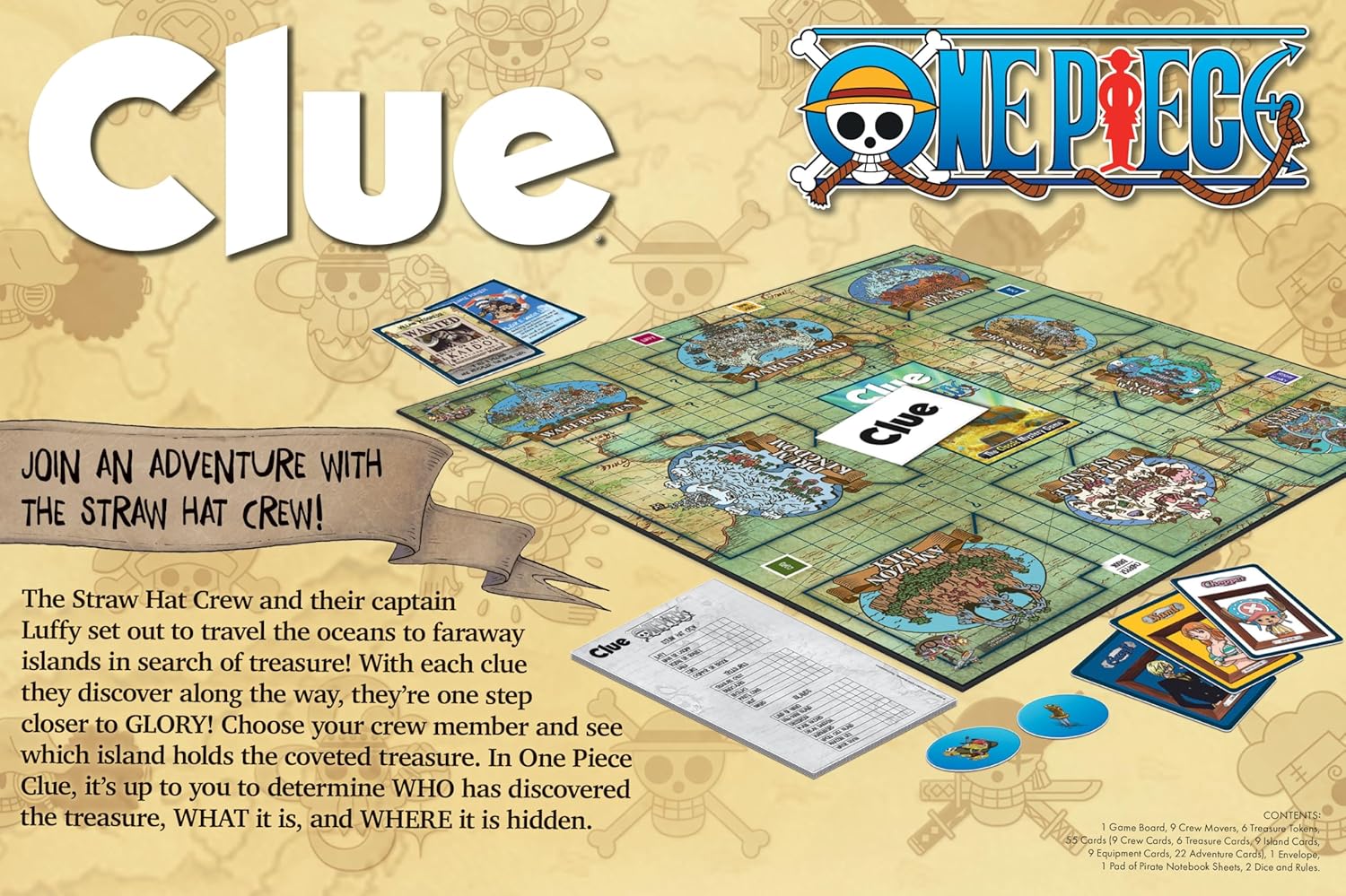 The Straw Hat Crew and their captain Luffy set out to travel the oceans to faraway islands in search of treasure! With each clue they discover along t he way, they’re one step closer to GLORY! Choose your crew member and see which island holds the coveted treasure. In One Piece Clue, it’s up to you to determine WHO has discovered the treasure, WHAT it is, and WHERE it is hidden.