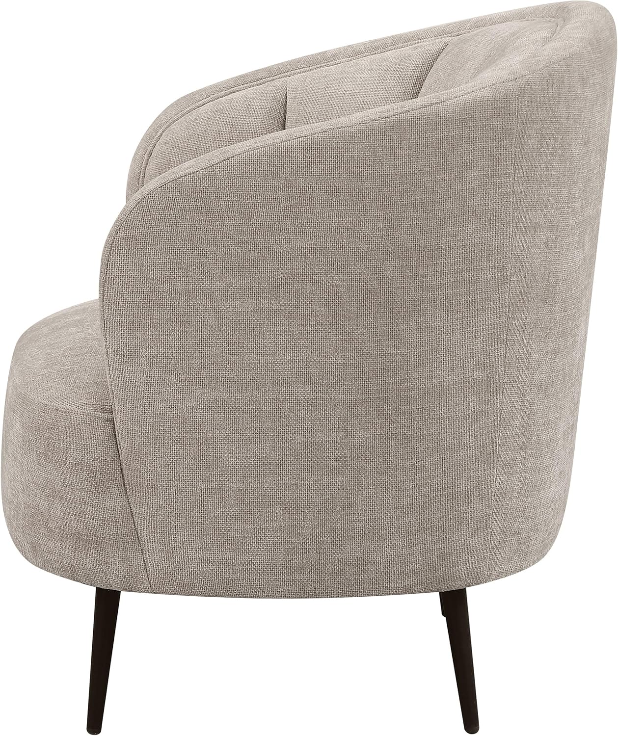 This accent chair features soft beige upholstery and a plush foam cushion for inviting comfort, complemented by a gracefully rounded barrel back and elegant channel details. The gently sloped arms provide added support, while the sturdy wood frame and durable wood construction ensure lasting quality. Finished with a sleek metal base, metal legs in a refined black finish, and tapered black feet, this upholstered accent chair is a sophisticated accent chair for the living room and a standout piece in your home furnishing and home furniture collection. Dimensions: Chair Seat Dimensions: 19.5 inches high x 20 inches wide x 22.75 inches deep