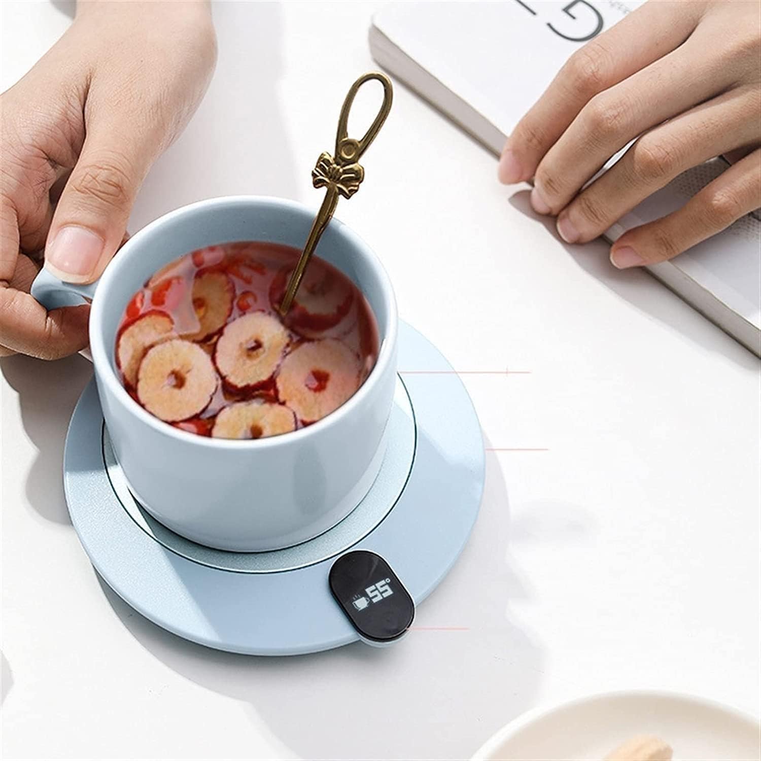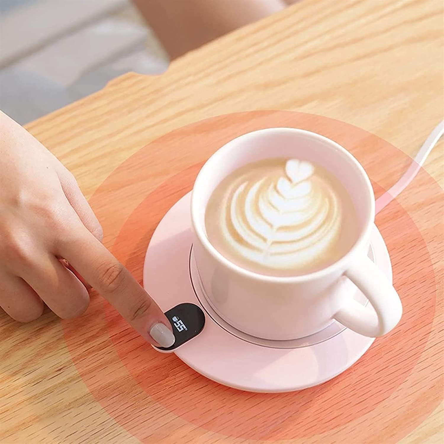 : Name: Coffee Mug Warmer Color: blue, pink, white Material: ABS+Aluminum Power supply: 5V2A Size: 130*18mm Weight: 80g Operation mode: smart touch Feature: Don' t worry about hot drinks getting cold. Easy to carry, carry and use, almost anywhere. The surface is easy to wipe clean. Instructions for use: 1. Place the coffee insulation board on a flat surface. 2. Plug the power cord into the socket. 3. Put the cup on the heating plate, and the coffee heating plate will automatically heat the beverage. Product packaging: 1* Coffee Mug Warmer( with Cup) wish you a happy life! If you have any questions after receiving our products, please contact us in time, we will reply and solve the problem within 24 hours.
