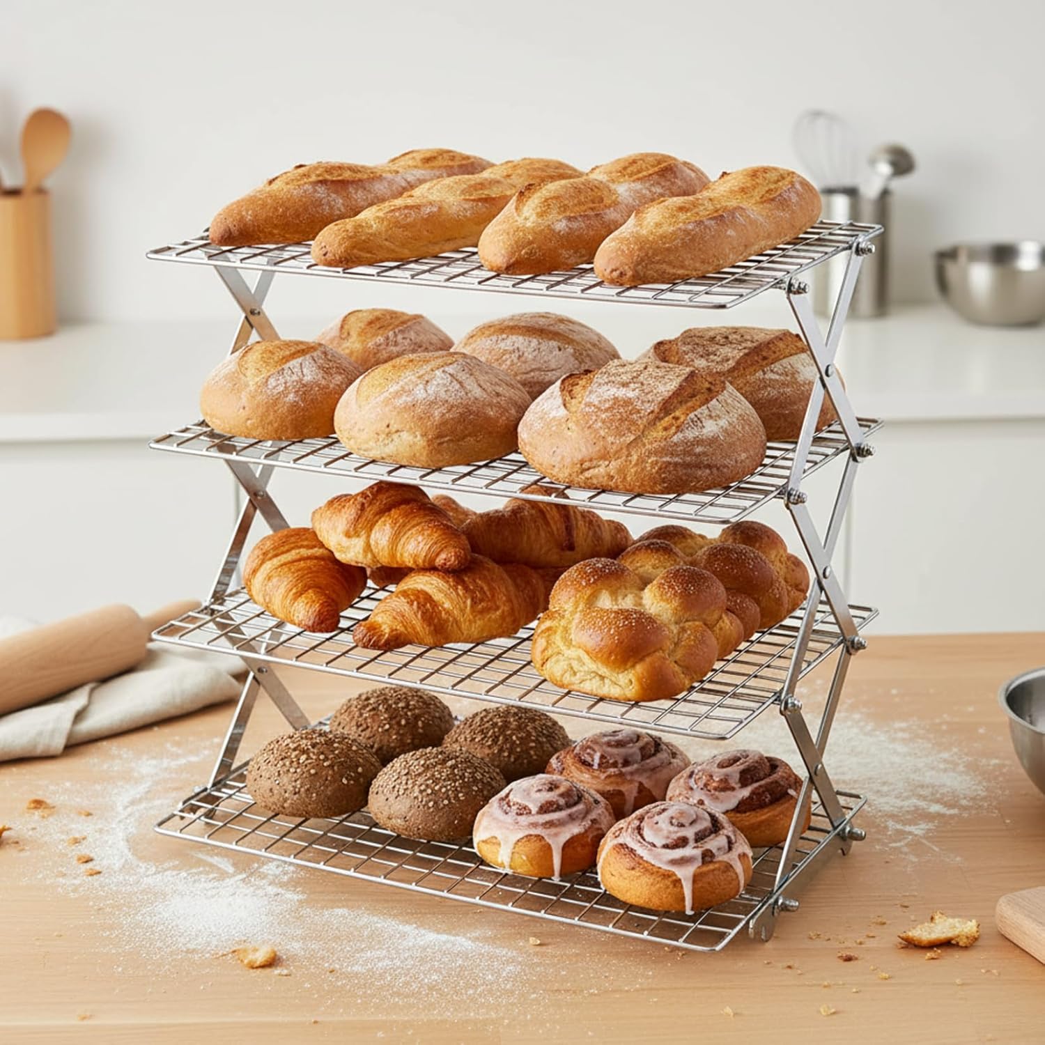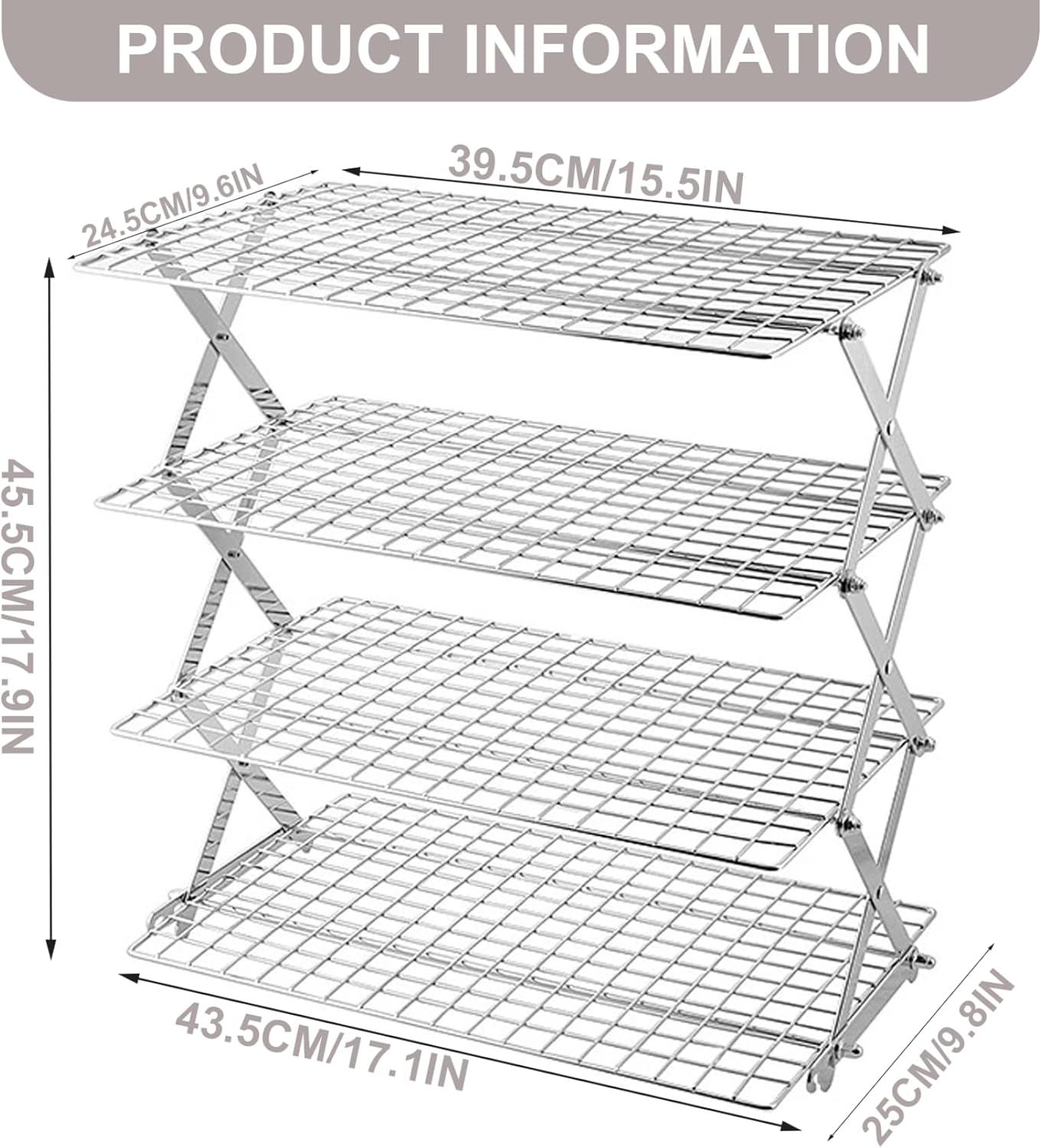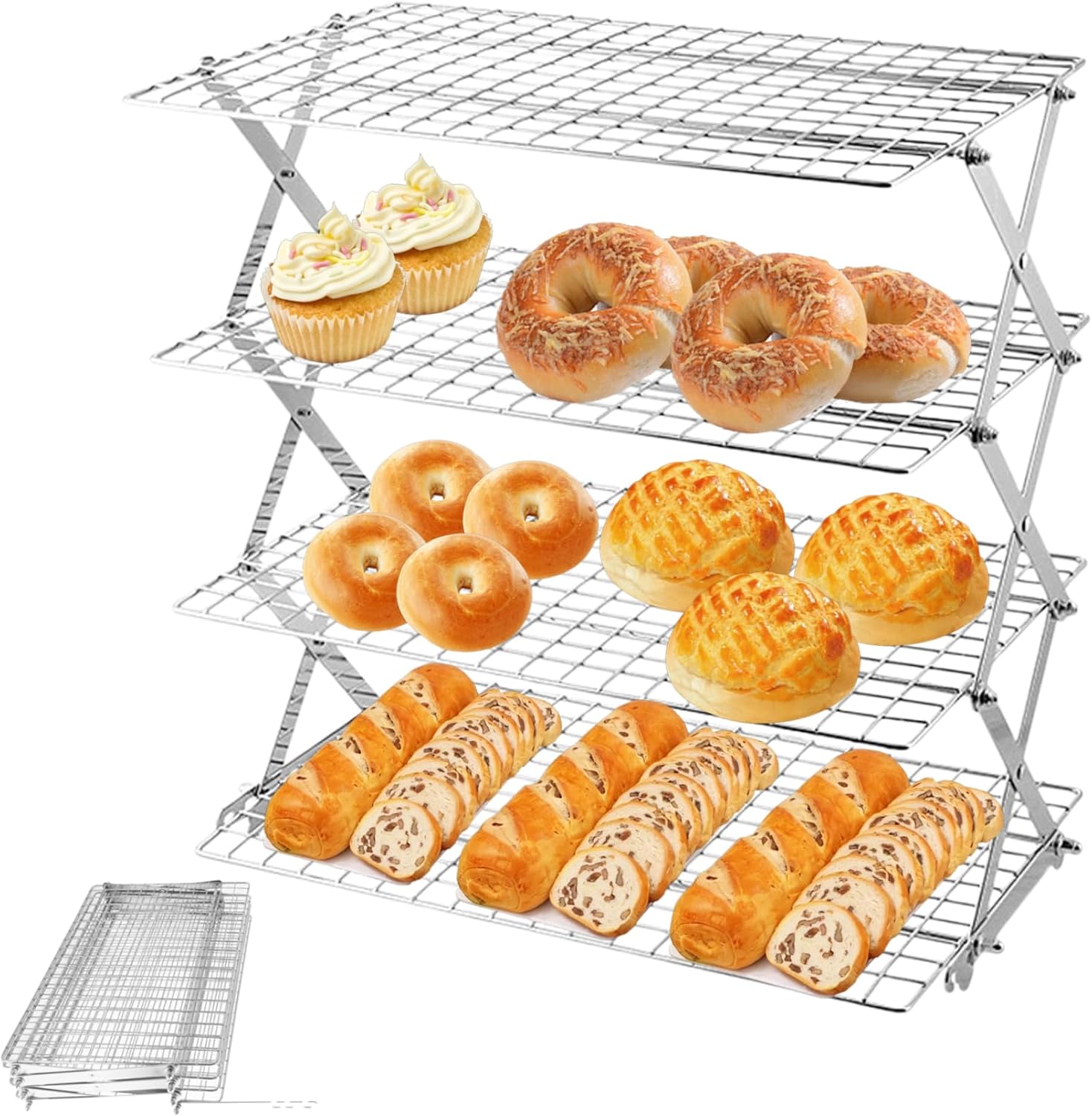 Description: The Collapsible Cooling Racks for Baking make an efficient, solution for cooling baked goods with a four-tier hollow-out iron structure that ensures stability while allowing air circulation for rapid cooling. Designed with adjustable spacing, it accommodates different sizes of cookies, pies, pancakes, and other baked treats while saving counter space by folding flat for easy storage. Its sturdy iron construction resists rust, making it a reliable kitchen accessory for frequent bakers. This collapsible, multi-tier cooling rack allows bakers to cool multiple batches simultaneously, boosting kitchen efficiency and making it suitable for both home and professional baking needs. Ideal for cookie cooling racks and versatile in use, this cooling rack combines practical design with convenient adjustability to enhance your baking and cooking experience. Features:. -Color: Silver. -Material: Iron. -Size: 43.5x45.5x25 cm/17.1x17.9x9.8 inch. Note:Manual measurement, please allow slight errors on size.The colors may exist slight difference due to different screens. Package Including 1 * Collapsible Cooling Rack
