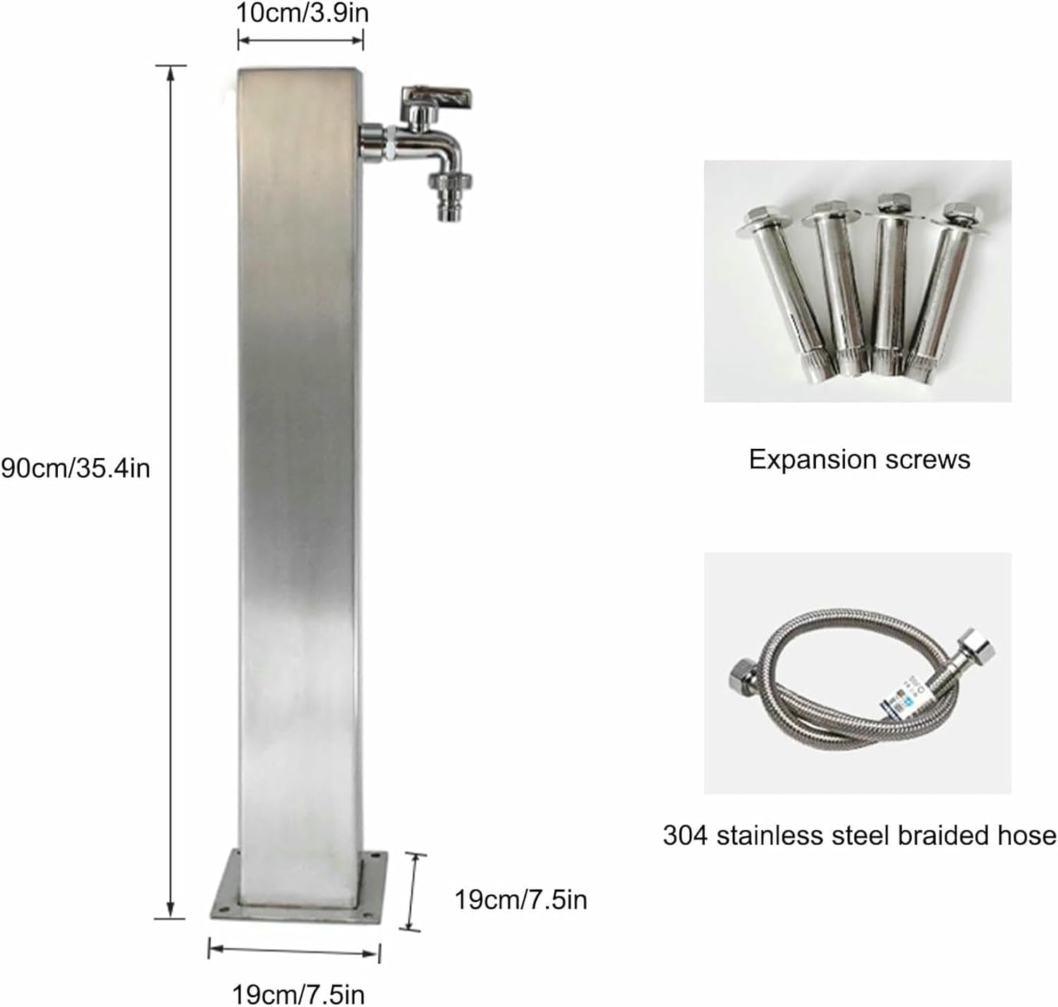 This garden water column uses durable materials and practical design to carefully create outdoor water solutions. Whether it is large-scale irrigation on farms, courtyard waterscape decoration, cleaning and maintenance of workshop equipment, or daily water use at home, its versatility can be flexibly adapted to various scenarios. Its durable and weather-resistant characteristics can maintain stable performance even in long-term outdoor use, making it an ideal choice for outdoor water use that takes into account practicality and reliability./···Specifications- Product name: Outdoor vertical water column faucet- Product material: 304 stainless steel- Product size:Height: 61 cm/24 inches, 90 cm/35.4 inchesColumn size: 10*10 cm/3.9*3.9 inches- Installation method: Ground entry/side entry- Fixing method: External flange- Scope of application: Suitable for villas, courtyards, lawns, gardening, schools, parks, workshops and other scenes