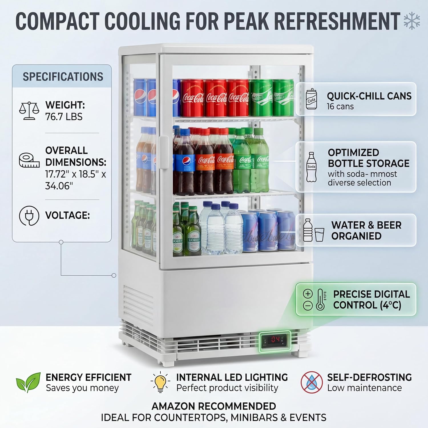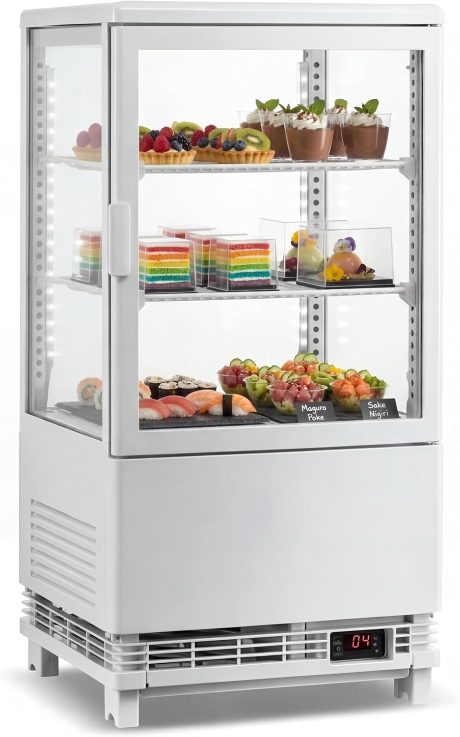 This 2.0 cu.ft. countertop refrigerated display case features efficient air-cooling, triple-layer insulation, bright LED lighting, and adjustable shelves. Perfect for bakeries, cafes, and restaurants, it offers precise digital temperature control and easy rear sliding door access to keep pastries fresh and attract customers.