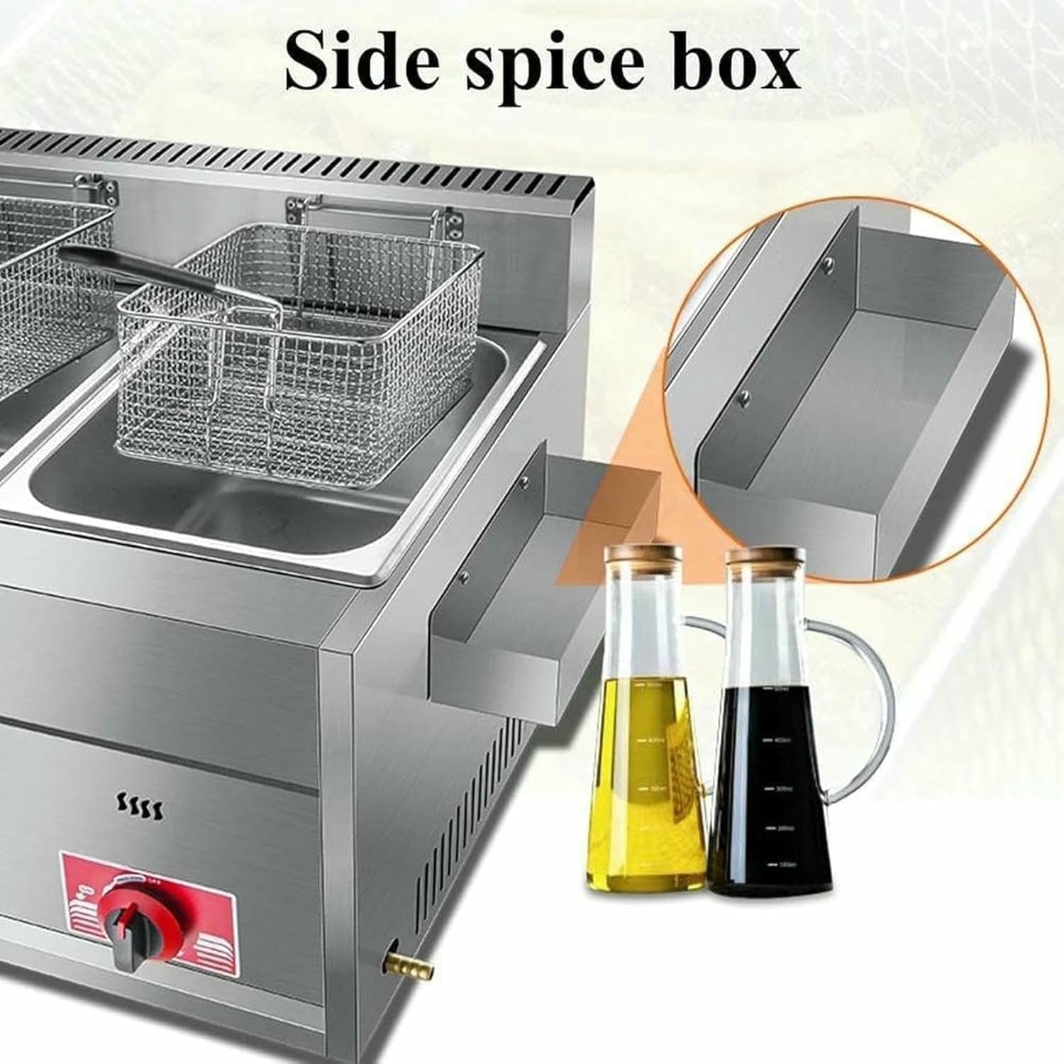 product name:Double-cylinder gas fryerBody size: 550 * 460 * 420mmProduct gas source: LPGcapacity:10L+10LCylinder size: 240 * 300 * 150mm * 2Product material: stainless steelPower: 6.64KWPlease note1.If you have any questions, please do not hesitate to contact us.2.We are manually measuring, there may be 1-3cm error, please prevail in kind.