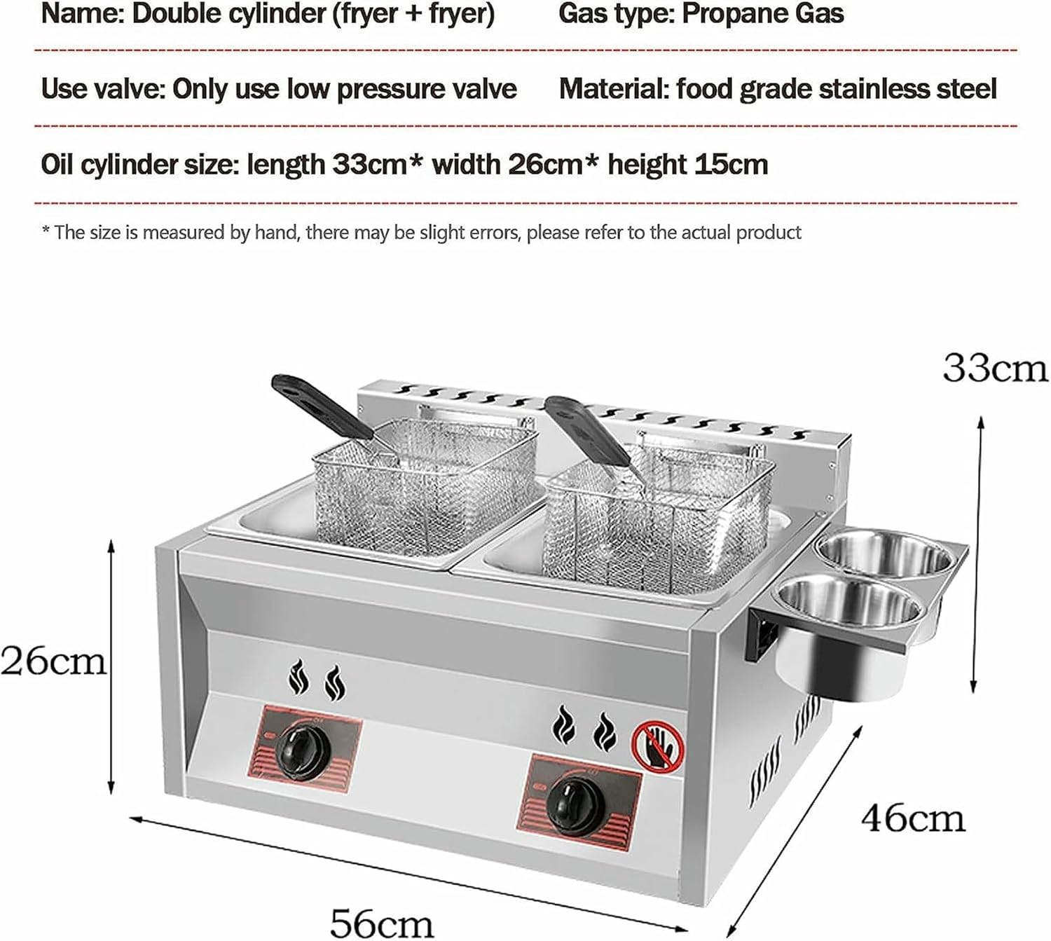 A Must-Have Deep Fat Fryer in Your Kitchen! You can enjoy fish & chips at home With this Deep Fat Fryer you could make more healthy and creative recipes by yourselves! The thermostat control allows you to set perfect temperature for different ingredients, such as fried doughnuts, fritters, chocolate bars, popcorn chicken, spring rolls, dumplings--the food lists is endless! And the frying basket is able to fry enough ingredients for family sharing for one time. It is time-saving and energy-saving. From Frozen or Fresh Whether you're a fan of artisanal hand-cut fries or the simplicity of frozen spuds, create a satisfying, golden-brown crisp in minutes. Leftovers falling flat? Give them a boost with a quick dip in the fryer for a better crunch than ever. Season with your favorite fresh or dried herbs and spices, or a simple sprinkle of salt and pepper. Powerful & Automatic Thermostat Thanks to the high performance of the removable heating element the oil in the deep fryer reaches the maximum temperature of 200C extremely quickly. If a temperature of about 180°C is reached, you can produce large quantities of fries in a short time due to the performance and the tank volume. For optimal cooking results, the highly sensitive, energy-saving thermostat keeps the heat of the oil tank at a constant temperature. Product List: 1 x Deep Fryers (Does not include other) Warm Tips: Please disconnect the propane gas and wait the oil temperature drops before cleaning.Then use wet towel to clean the surface and wire. This professional deep fryer with oil cylinder and basket, Please check the size and power carefully before buying.