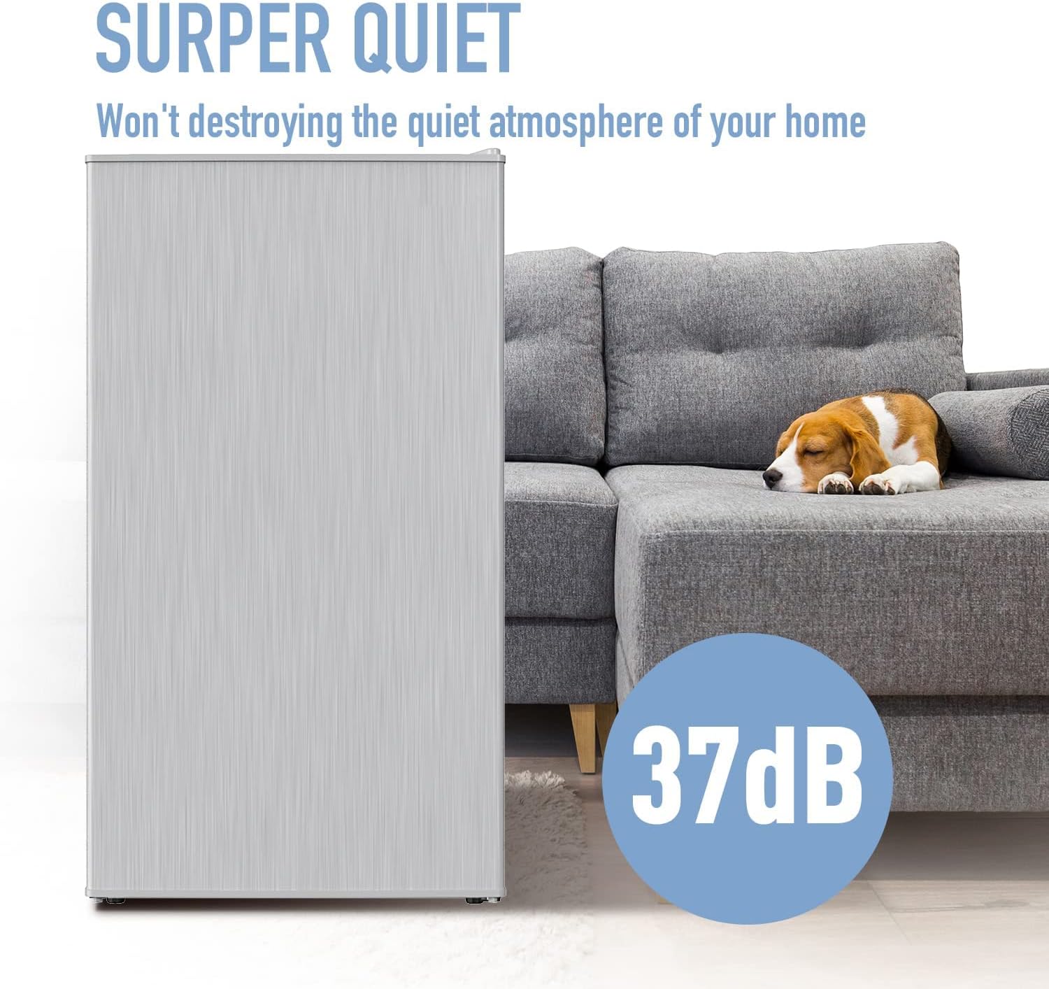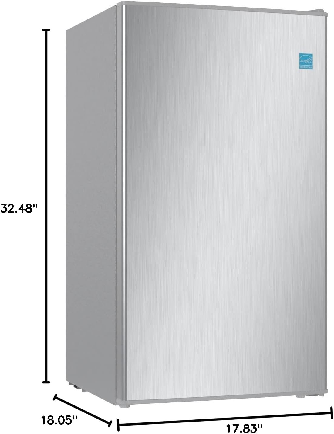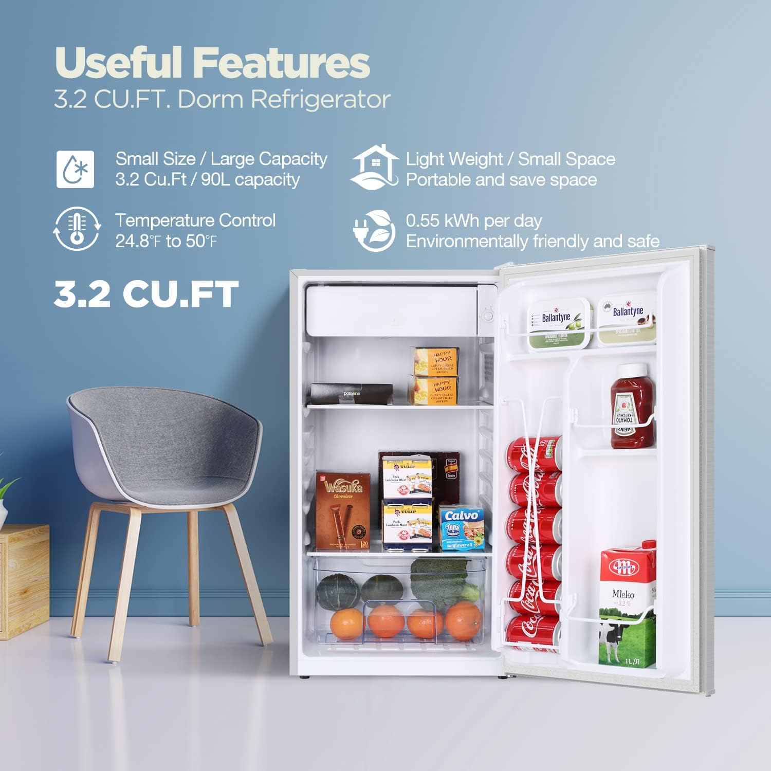 PRODUCT DESCRIPTION ────────────────────── ▲ 3.2 cu.ft. compact refrigerator with small freezer ▲ Mini fridge dimension is 18.05’’D x 17.83’’W x 32.48’’H, can be placed under your desk. ▲ Reversible door that can be set to open from left or right, suit for different environments. ▲ Adjustable feet of mini refrigerator adapting to uneven surfaces. ▲ Removable glass shelves can be removed,if you want put some taller thing. ▲ The Soft detachable door seal makes cleaning easy. ────────────────────── ☑ The noise generated by small refrigerator at work is only 37db. ☑ Supported by Energy Saving certificate, it only 0.55 kWh per day. Both affordable and low-carbon lifestyle. ☑ No need laborious defrosting by your hands, just press the defrost button in the middle of the temperature control knob. ☑ This small fridge also comes with a light-degree freezing storage for ice cubes. DETAIL ────────────────────── - Color: Inox - Size: 3.2 cubic feet mini refrigerator - Reversible Door: Yes - Adjustable Leg: Yes - Handle: Recessed - Temp Control: 6 temperature modes - Defrosting: One-touch easy Defrosting - small refrigerator for bedroom - 3.2 cubic feet mini fridge - refrigerators small size