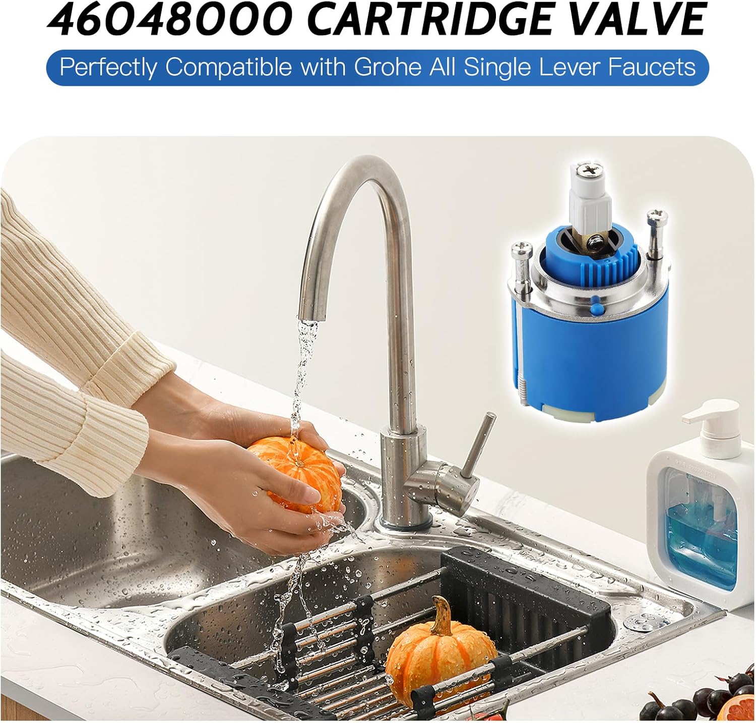 Compatible with Grohe 46048000 single handle mixing valve, with a filter diameter of 46mm, ceramic sealing system and adjustable flow restrictor, suitable for all single handle faucets