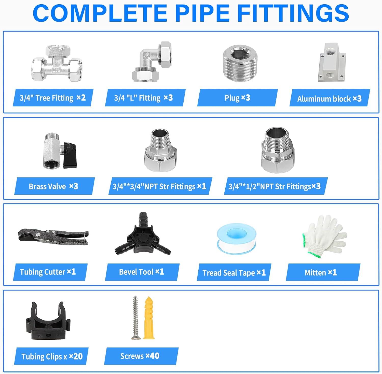 | Included Components | 1pc Tubing Cutter 1pc Bevel Tool 8pcs 1/2"*3/8" NPT Str Fittings 3pcs 1/2"*1/2"Tubing Tee Fittings 1pc 3/8"*3/8"Aluminum Blocks 5 pcs 3/8"NPT Brass Valves 5pcs 1/4"NPT 45°Elbow Adapters 5pcs 3/8"*1/4"Aluminum Blocks 1 pc 1/2"*1/2"NPT Str Fitting(Free) 40pcs Screws 40pcs Metal Pipe Clamp Mitten x1 Waste Bunker x1 1/4"NPT Blocks x 5 3/8" Plug x 1 |